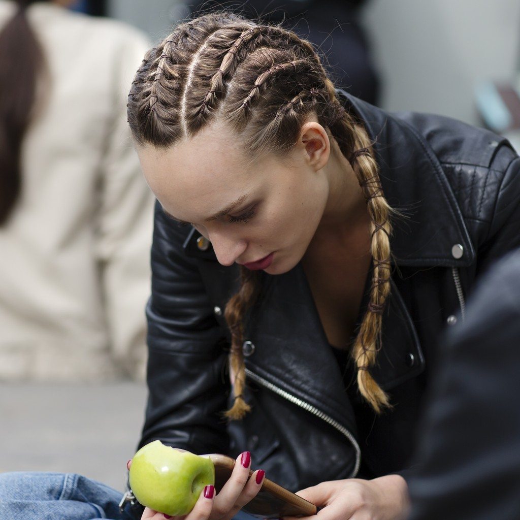 2. Starting at the nape, twist and stitch each section, using the KEVIN.MURPHY SEWING.KIT to form a tube. Secure at the nape. Spritz with KEVIN.MURPHY HAIR.RESORT.SPRAY