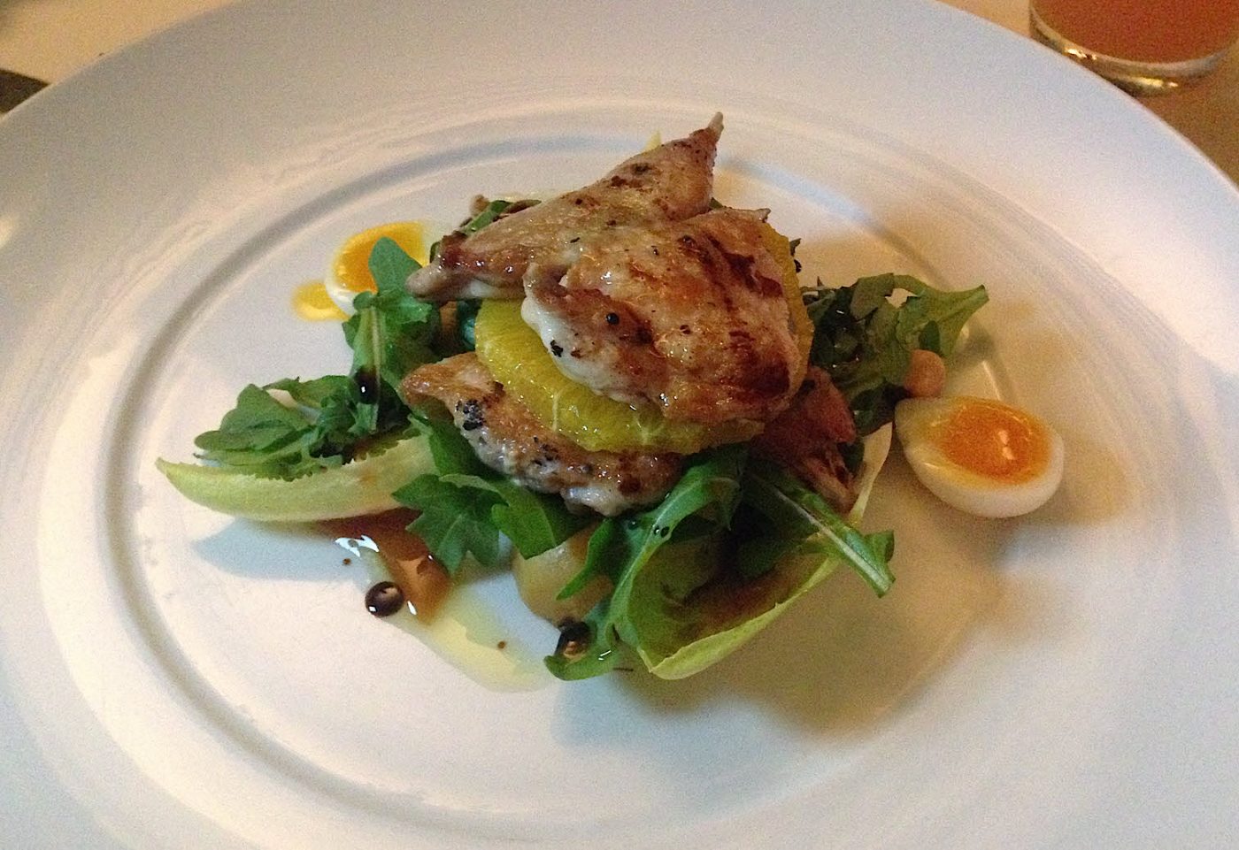 Char grilled quail salad, roasted hazelnuts, orange, pickled golden beetroot, witlof and caramelised palm sugar balsamic dressing.