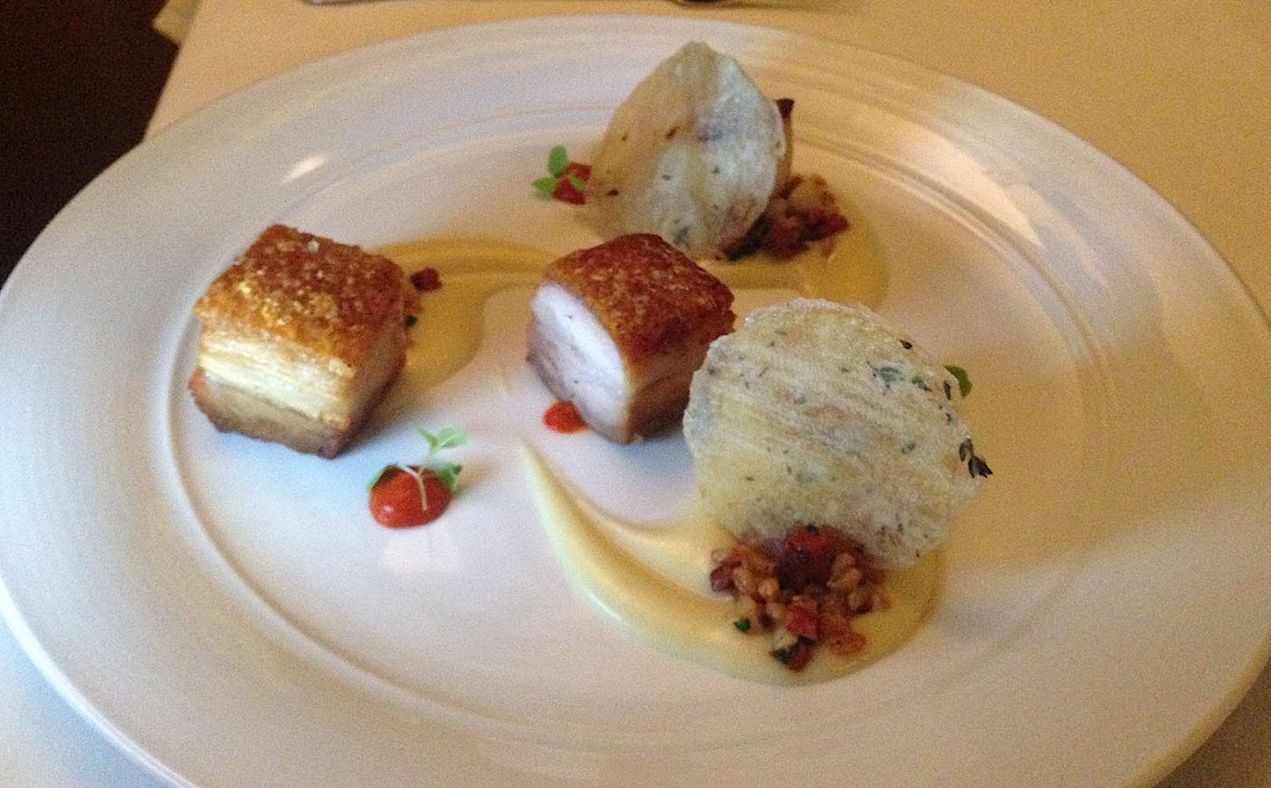 Crispy pork belly with pan seared sea scallops, lemon emulsion, chorizo, cuttlefish and pickle pepper coulis