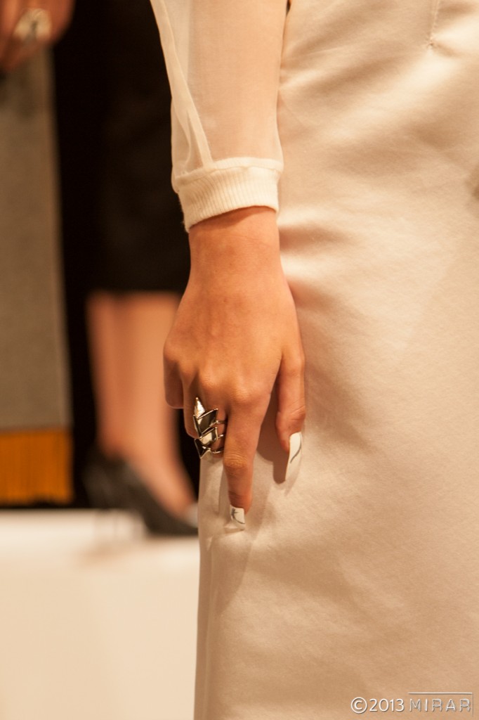 Ali Magliveras for essie gave girls “long and pointed talons”. Half of the models were given a white base on the nails (Blanc) and the other half a black base (Licorice), over which a silver detail was placed, using No place Like Chrome.