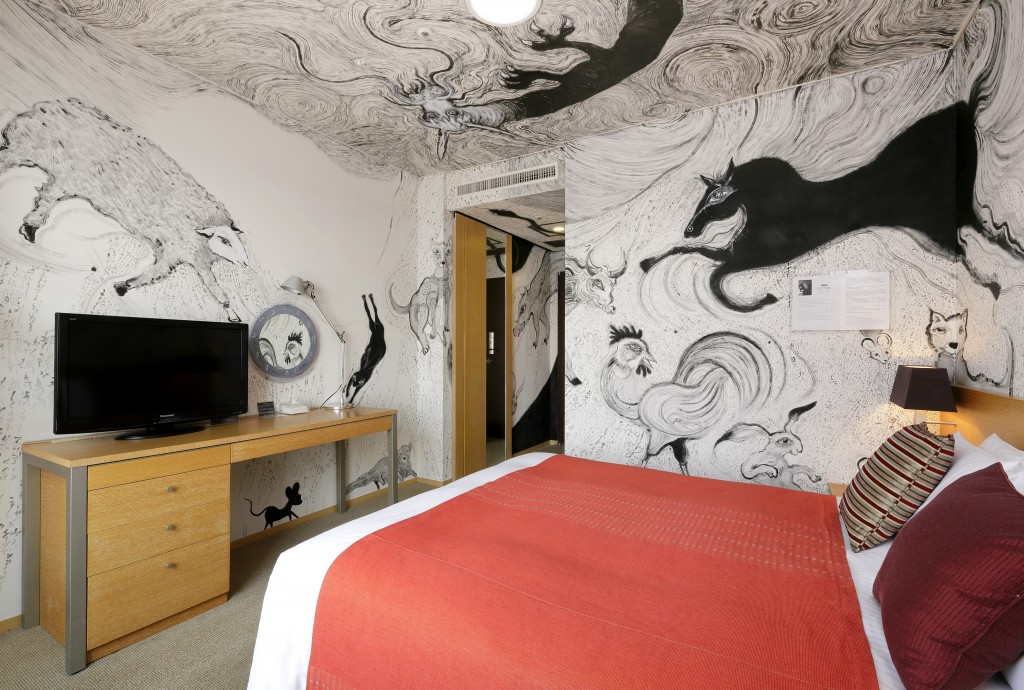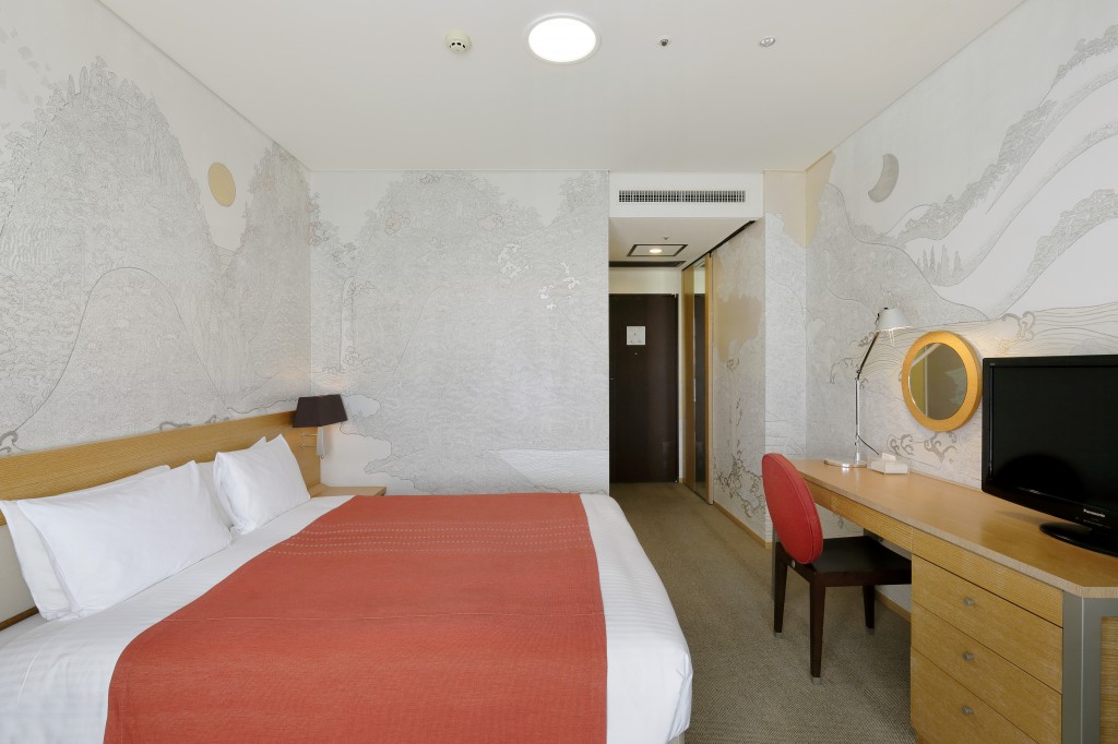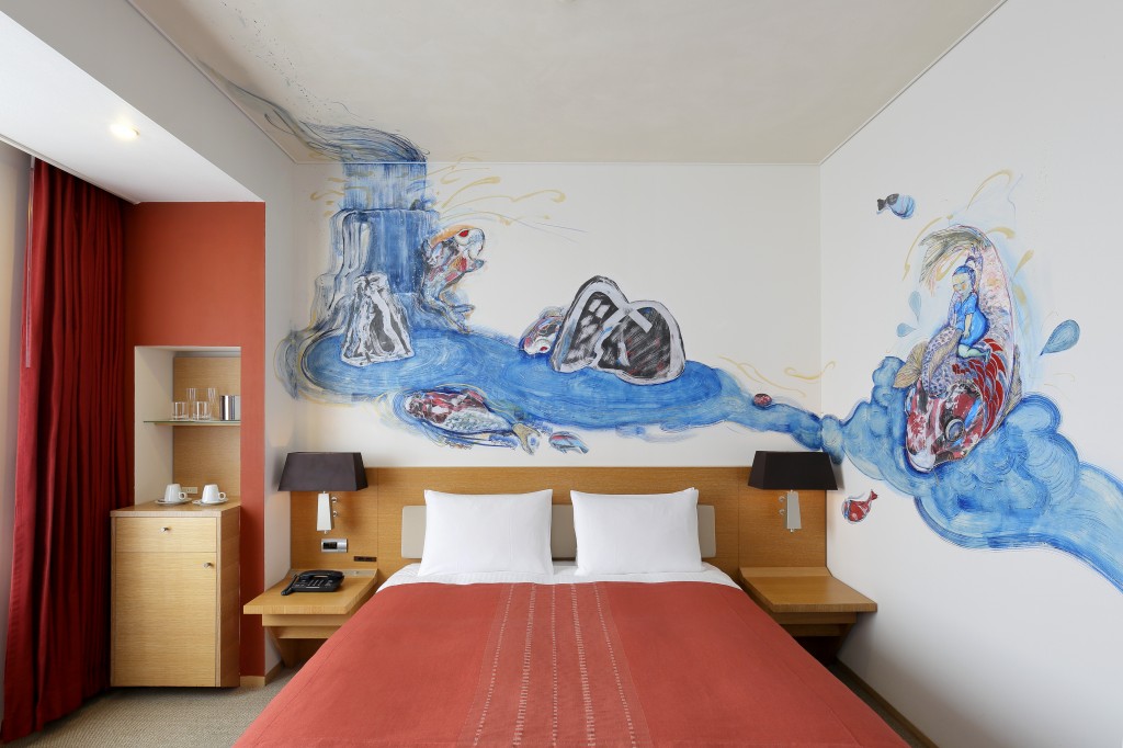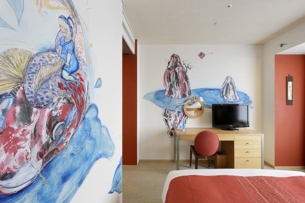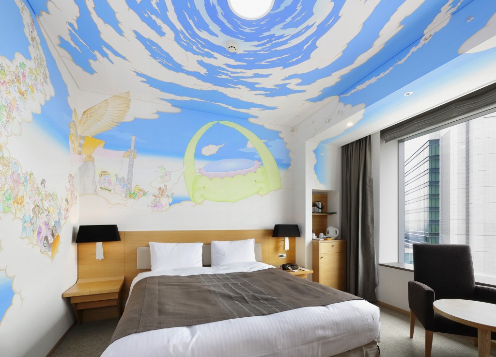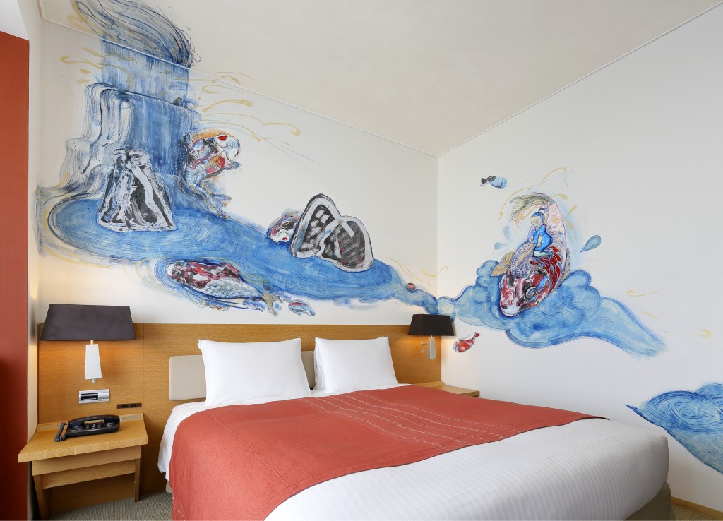 What really sets the Park Hotel apart from other hotels it its ‘Artist in Hotel’ concept. Started in December 2012 to launch in at the same time as the hotel’s 10th anniversary, the hotel has recruited some of Japan’s top artists to decorate an entire guestroom on the 31st floor of the building. To date, 16 rooms have been completed, with all 31 rooms on the floor expected to be completed by the end of next year. Guests can book into stay in one of these special rooms, each having its own special design. This is the unique way the Park Hotel is celebrating Japan’s artistic talent and history with its many guests. Highlights include the Dragon Room by Kiyoko Abe which features a painting of a huge black dragon flying across the room, the Zen Room by Seihaku Akiba, the Cherry Blossoms Room by Hiroko Otake and the Public Bathhouse Room by Keiko Migita. These rooms all capture a unique aspect of Japan’s rich culture.