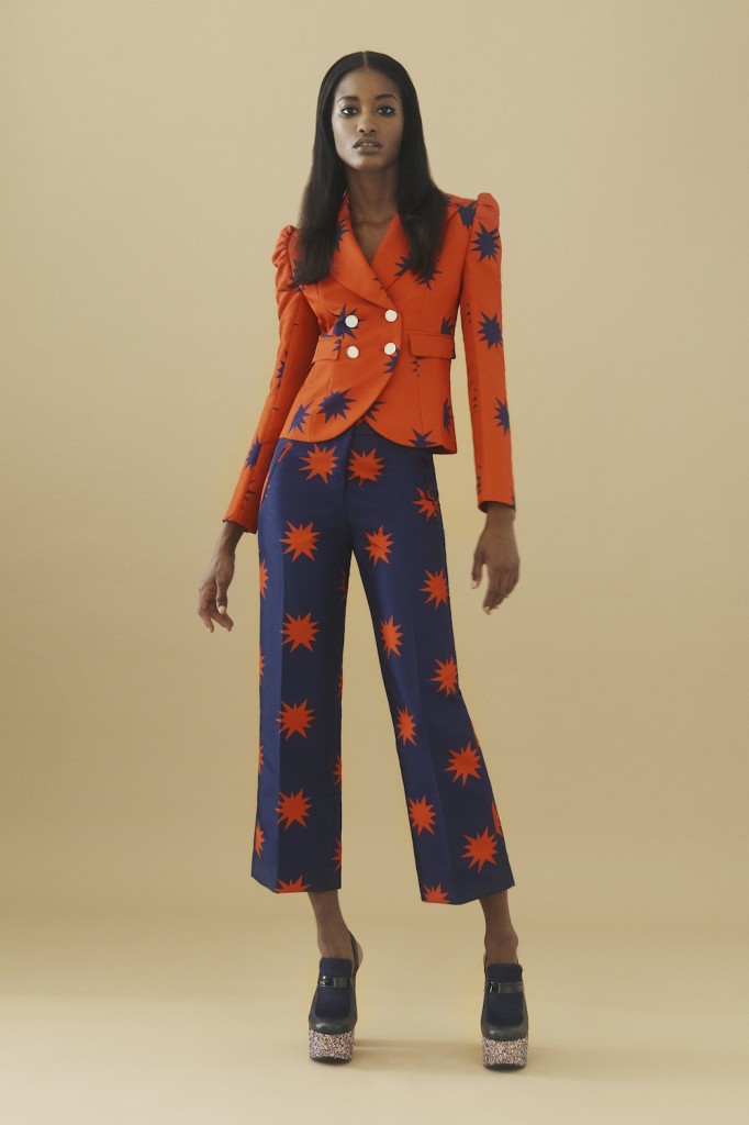 Geometric patterns in a sea of vibrant hues are played out on simple tunic shapes with novelty sleeves, and a starburst pattern features prominently, splashed across blouse dresses, blazers, prom dresses and kicked out bell-bottom trouser pants. Round brooches like gleaming barnacles adorn jumpers, tennis-style skirts and structured tops with oversized sleeves.