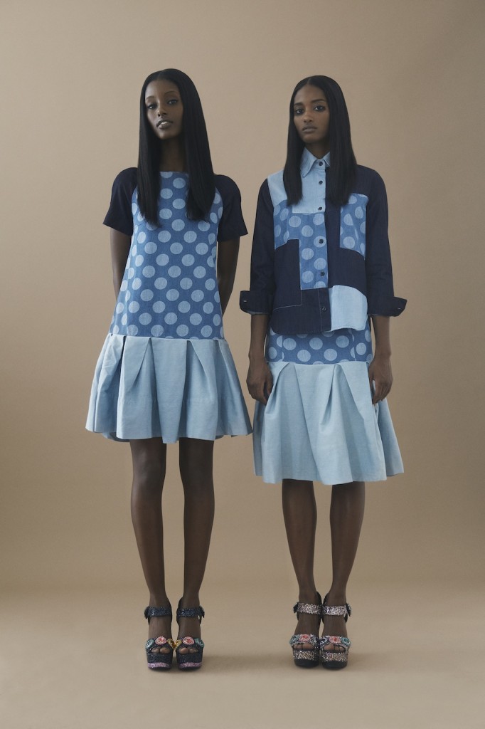 Also featured within the collection are embellished, knitted woolen pieces, a tube dress in a multi-coloured print that almost hurts the eyes to take in, it’s so bling, and more double denim than you can poke a curling wand at, with enlarged polka dots and high necked patched denim shirt dresses with drop hems and kicked out skirts.