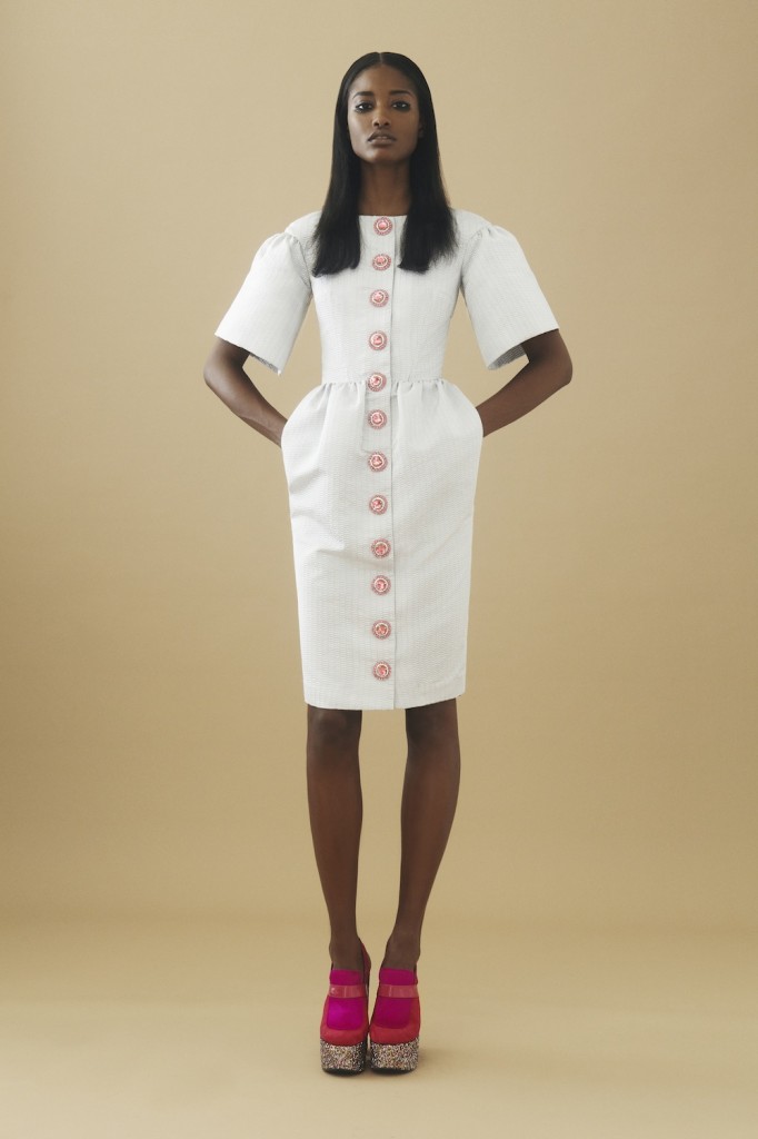 Henry Holland’s latest oeuvre is expectedly eclectic, but in a manner that veers away from his last Resort collection. Far from the varsity-style pastel hued cardigans and candy stripes, with fuzzy pom pom prints, inspiration seems to have skipped forward from ‘50s soda shop girl to sassy ‘60s diva.