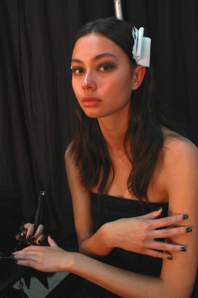 M.A.C makeup director, Gordon Espinet, kept the makeup look pure and simple for Haryono Setiadi’s show. “The clothes are very strong and there is a lot going on, so we decided the face is quite pure and innocent. The key is to have beautiful skin, it looks best without a lot of makeup”. Gordon is a proponent of following nature and not fighting nature so kept skin looking extremely natural prepping with M.A.C Fix+, M.A.C Prep + Prime Moisture Infusion Serum and M.A.C Mineralize Time Check Lotion, with the application of concealer used sparingly.