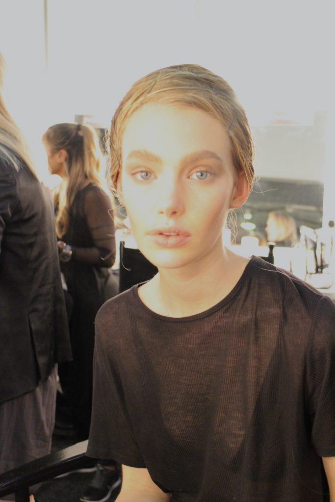 Carol Mackie followed the vision of ‘monks in Paris’ from Han designer Khim Hang and creative director, Margaret Zhang. “We used a lot of grey colours on the eyes and the lips” says Carol Mackie, a reference to the Cambodian heritage of Khim Hang and the collection. A bit of super gloss was added to the eye lids and face but matte down the centre. Skin was kept simple using oils, moisturises and highlighters with a bit of concealer where necessary. Brows were brushed up with pencil highlight on the inner corner of the eyes to brighten.