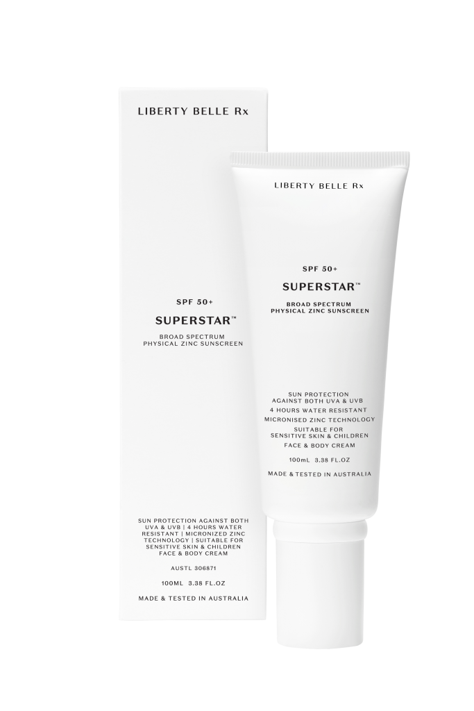 The latest addition to the Liberty Belle Rx range is the super luxe Superstar, an ultra-protective SPF 50+ cream that provides broad spectrum protection against both UVA & UVB exposure. This zinc based sunscreen is formulated for sensitive skin with hydrating Coconut Oil and antioxidant rich Vitamin E for free radical protection. This smart formula can also simultaneously help reduce the visible signs of skin ageing and can assist in the prevention of premature skin ageing.
