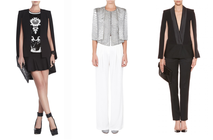 I’ve been lusting after Victoria Beckham’s take on the trend from her Fall 2013 RTW collection. An impeccably constructed hybrid of tuxedo jacket and capelet, it’s perfect for a sexier take on the classic suit. BCBG Max Azaria also do a similar version (pictured top left) without the silk lapel for a more downtown look.