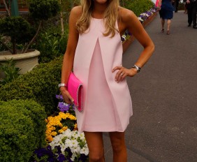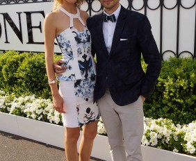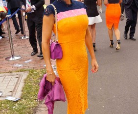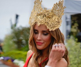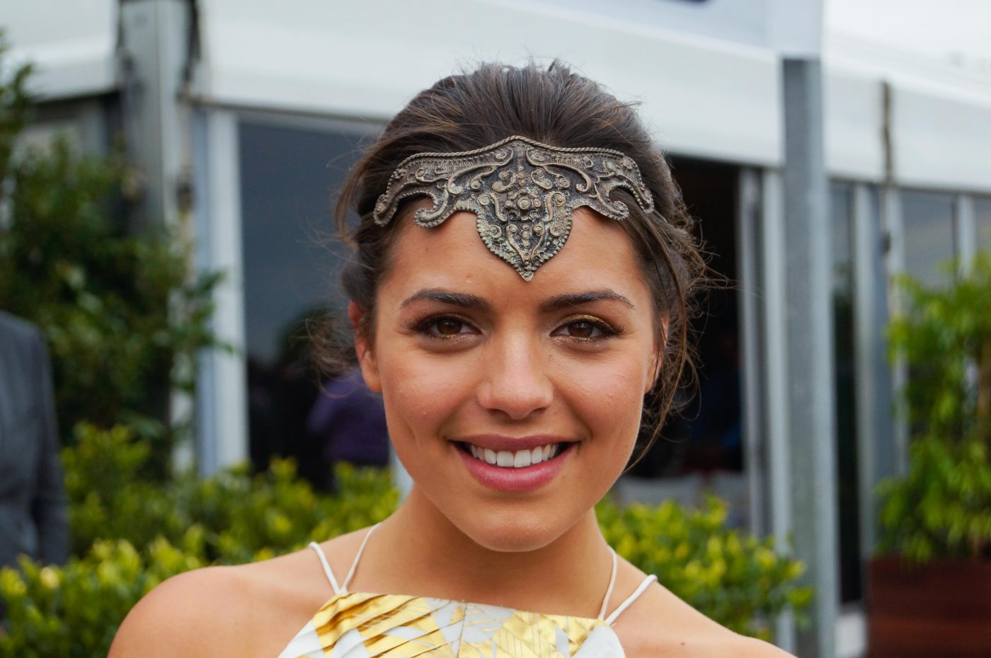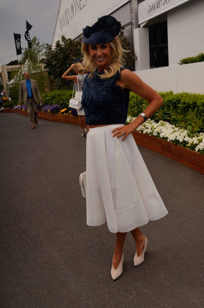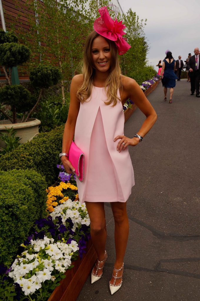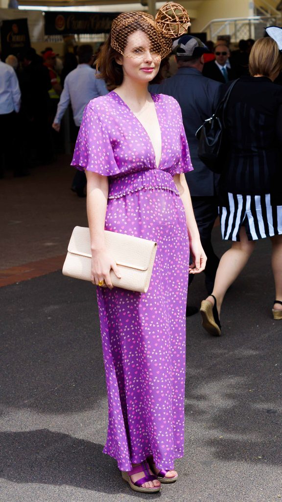 Well heeled punters within the exclusive David Jones marquee opted for muted colours and midi lengths. Maiden Sydney’s Brooke Testoni combined the subtle sex appeal of an exposed décolletage with a more traditional voluminous silhouette and ankle grazing hem in a Zimmermann number that epitomised the fresh, sophisticated look that reigned supreme trackside. Emma Freedman dazzled in navy and black fringed Willow, while Neighbours star Olympia Valance sported a modern bohemian look in a Thurley maxi.