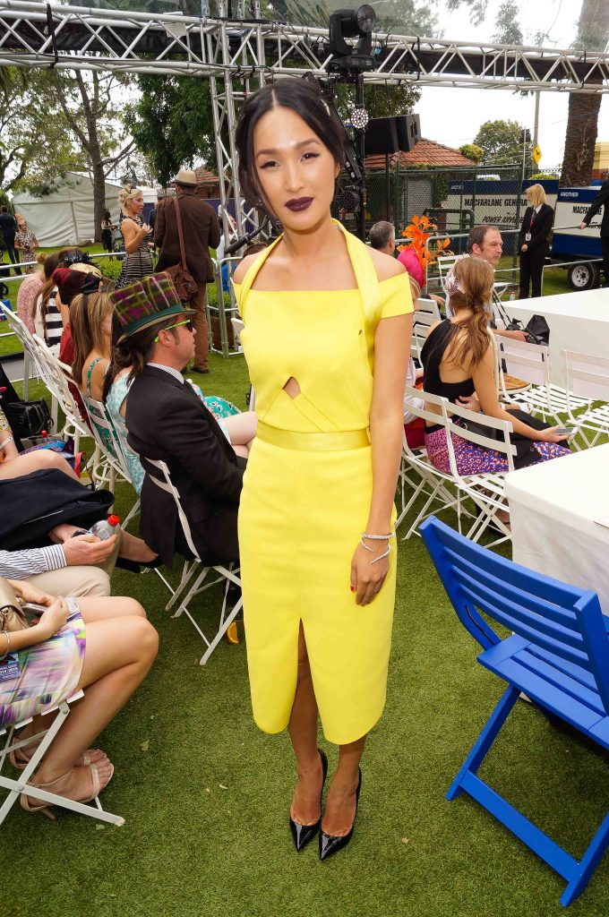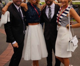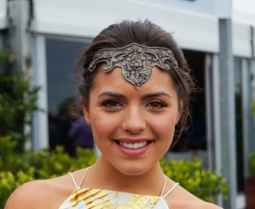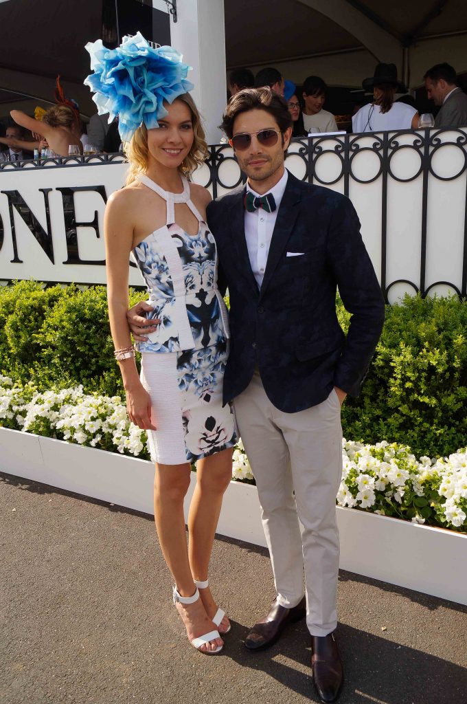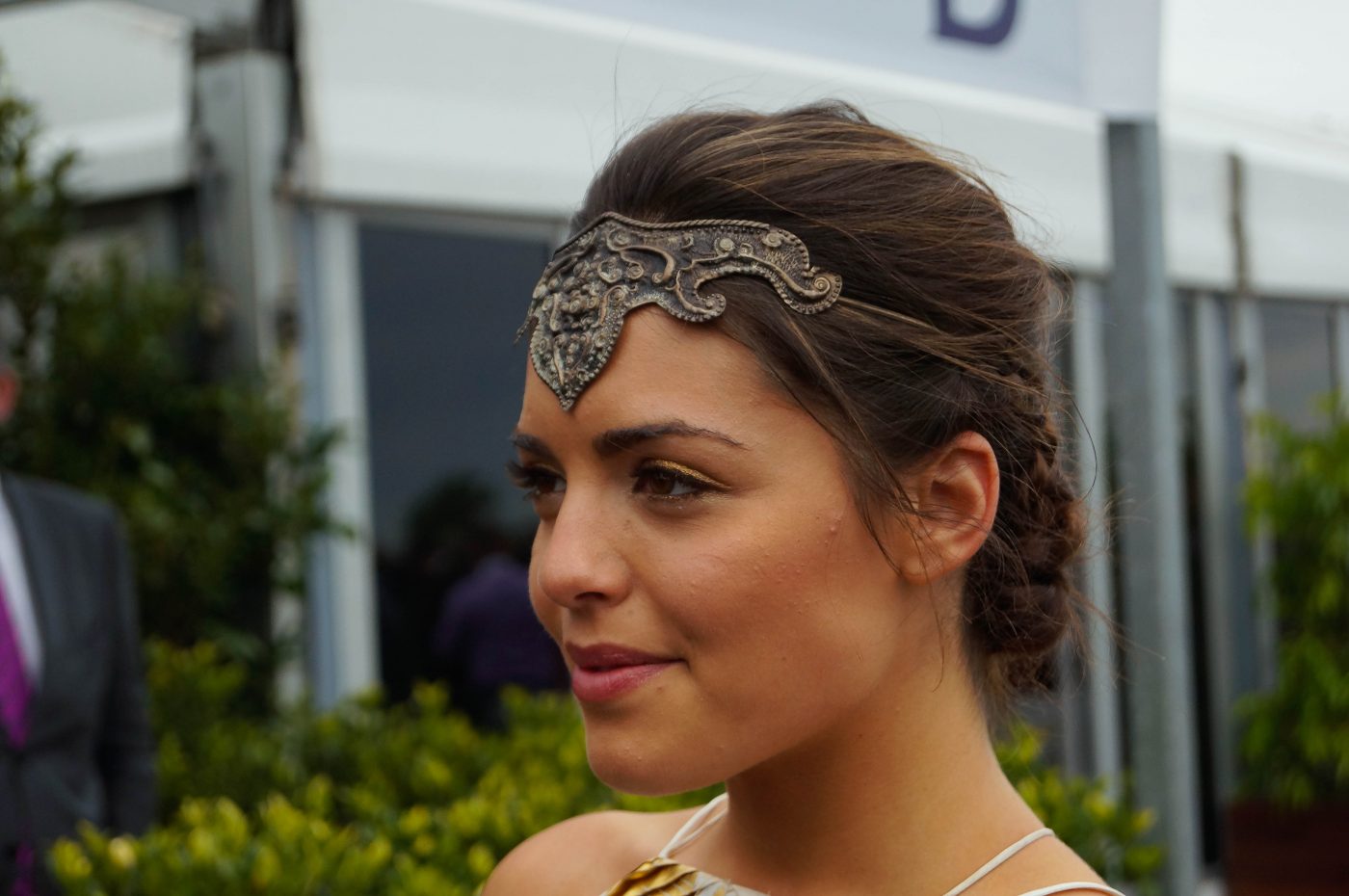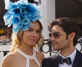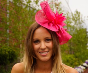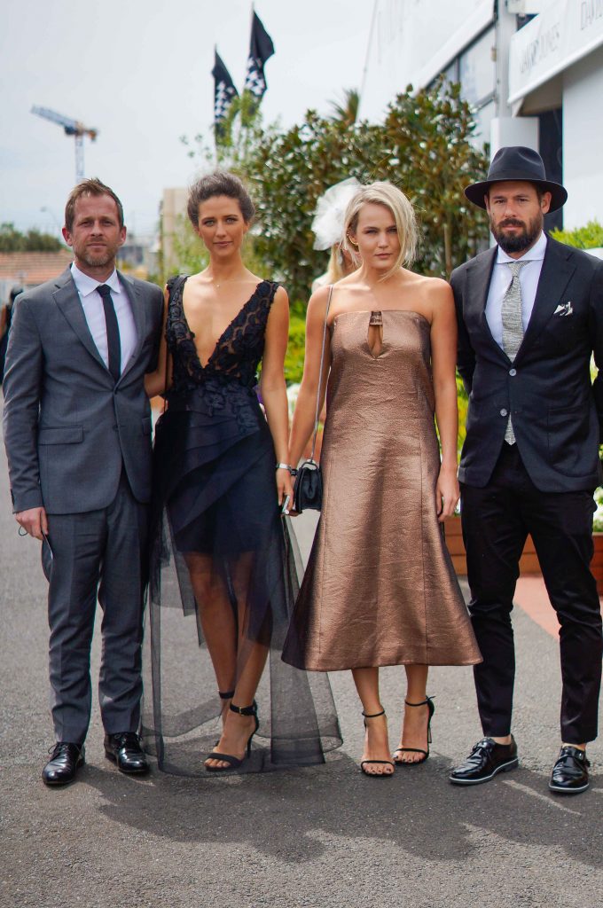 Well heeled punters within the exclusive David Jones marquee opted for muted colours and midi lengths. Maiden Sydney’s Brooke Testoni combined the subtle sex appeal of an exposed décolletage with a more traditional voluminous silhouette and ankle grazing hem in a Zimmermann number that epitomised the fresh, sophisticated look that reigned supreme trackside. Emma Freedman dazzled in navy and black fringed Willow, while Neighbours star Olympia Valance sported a modern bohemian look in a Thurley maxi.