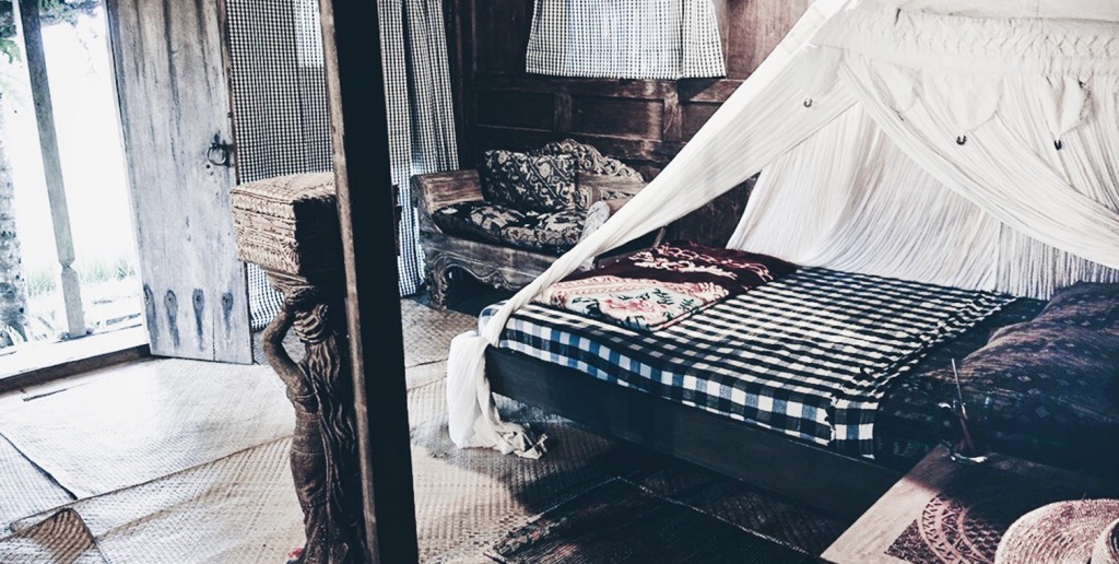Wayan is an artist and restorer of Balinese bungalows so every little hut on the property unique. They’re unlike any hotel in Bali – forget boring white linen, loud air conditioners and mini bars – these are the real deal. Inside the beautiful wooden huts are mosquito net draped beds with mish-mashed textiles (mine were checks!), a sink, a couch and a door which leads to the outside bathroom.