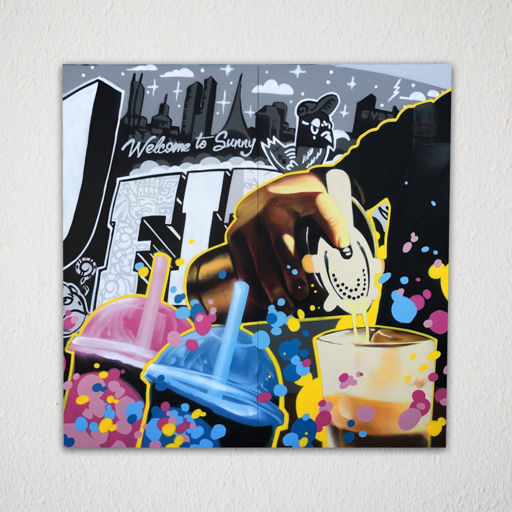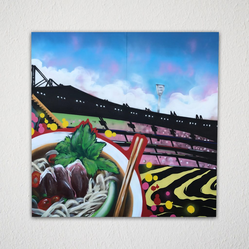 To celebrate their first Melbourne birthday, UberEATS commissioned local Melbourne artist Heesco Khosnaran to paint 7 iconic suburbs of Melbourne. With the assistance of artist Seb Fransz, Heesco has created 7 pieces of artwork which captures iconic landmarks and cuisines. Over the next 6 days, this artwork is being auctioned off on eBay, with all proceeds going towards the Feed Melbourne Appeal.