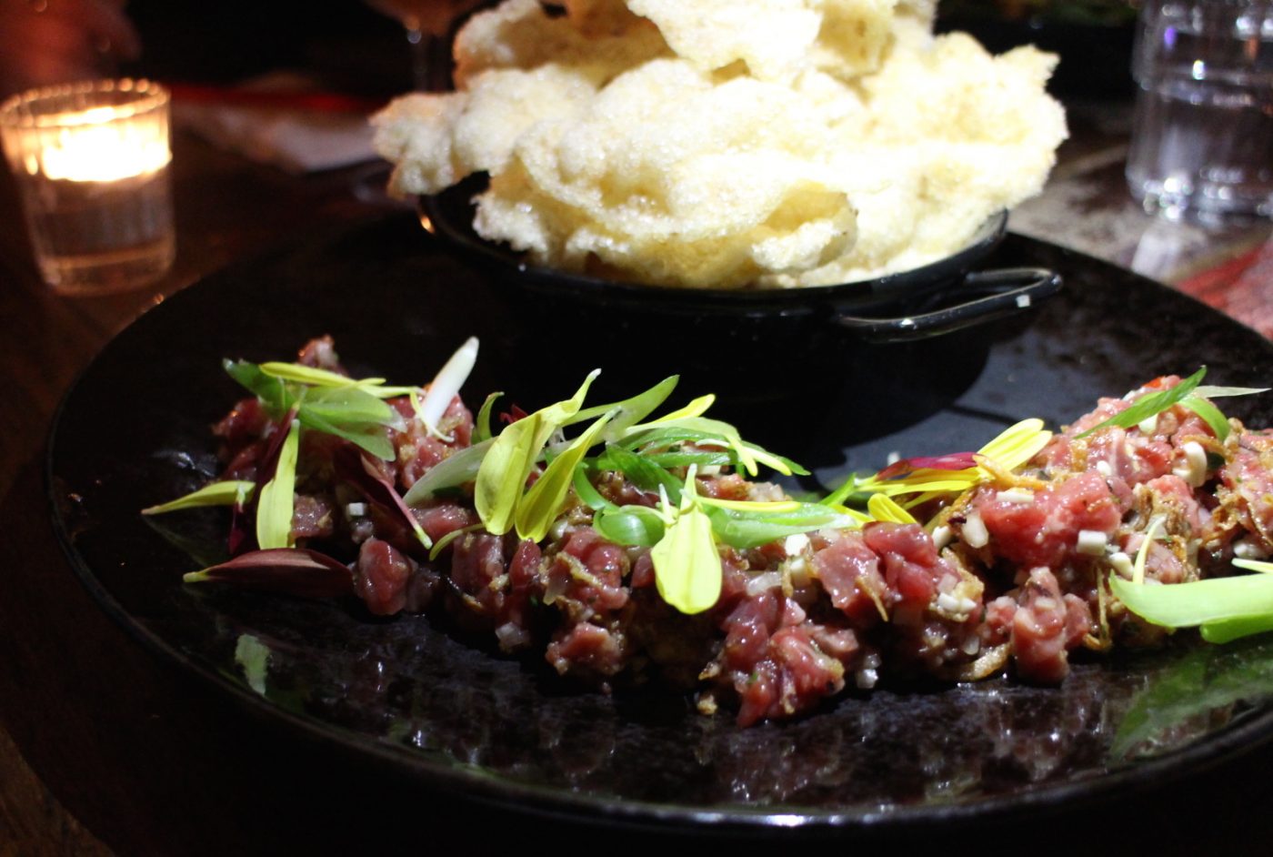 On the evening we visited, we tried a variety of different dishes beginning with a few small plates to share, just to whet the appetite! We enjoyed the Kingfish device with pomelo, green papaya, shallots and chilli on betel leaf which was a fresh start to the meal. Fried chicken ribs with Gocuchang, sesame, garlic and Sriracha Mayo was a bit of meatier appetiser and you really can’t ever go wrong with fried chicken. We followed this with Seared Scallop with Green Curry, Apple and Salmon Roe which was an interesting dish that was sweet, salty and spicy. A lovely spark to the starter dishes.