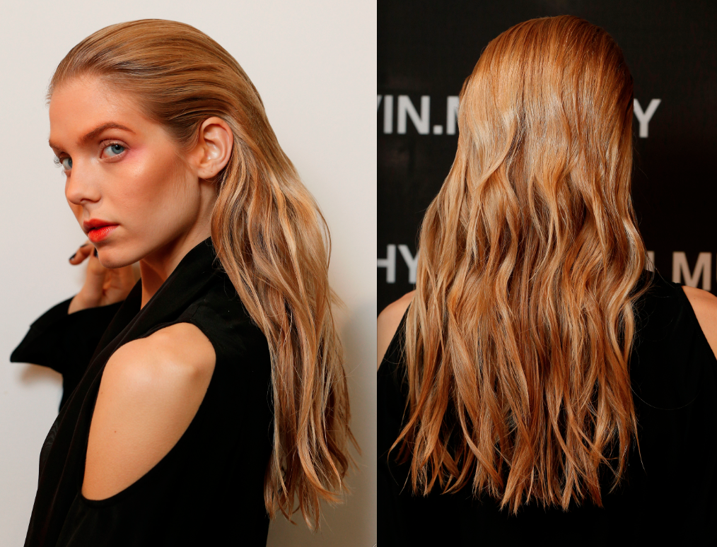 The inspiration of the look this year was water and feather, with Kevin Murphy creating a textured beach wave with a sleek wet finish, ensuring the final product was polished and chic.