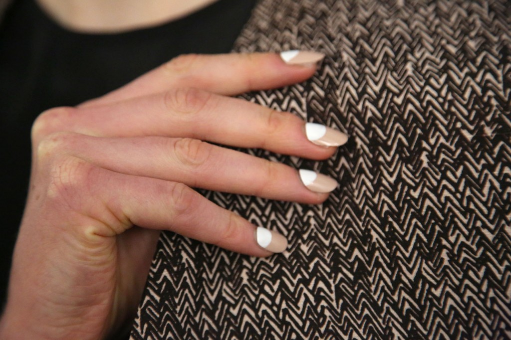 The sideward french nail appeared on the beautifully manicured nails of models at day five of fashion week. Katie Holmes and Jeane Yang trended the hot new look using a sheer creamy off-white nude and slanted french tip in OPI’s deep blue ‘I Saw…U Saw…We Saw…Warsaw’.