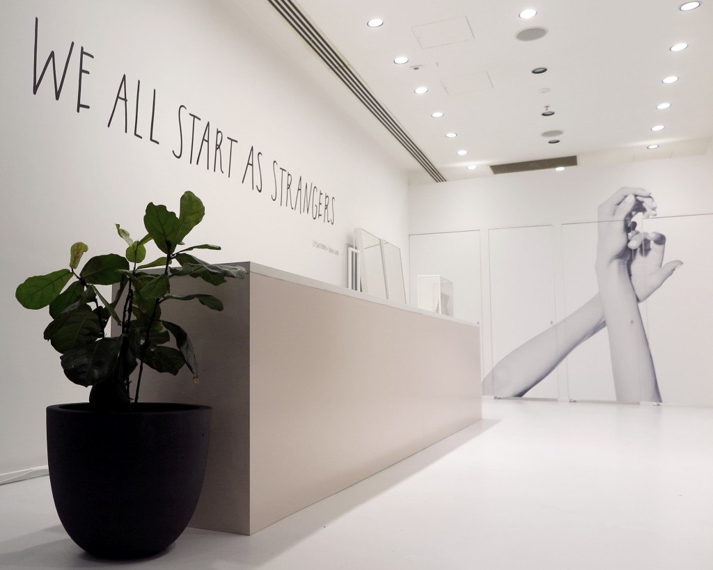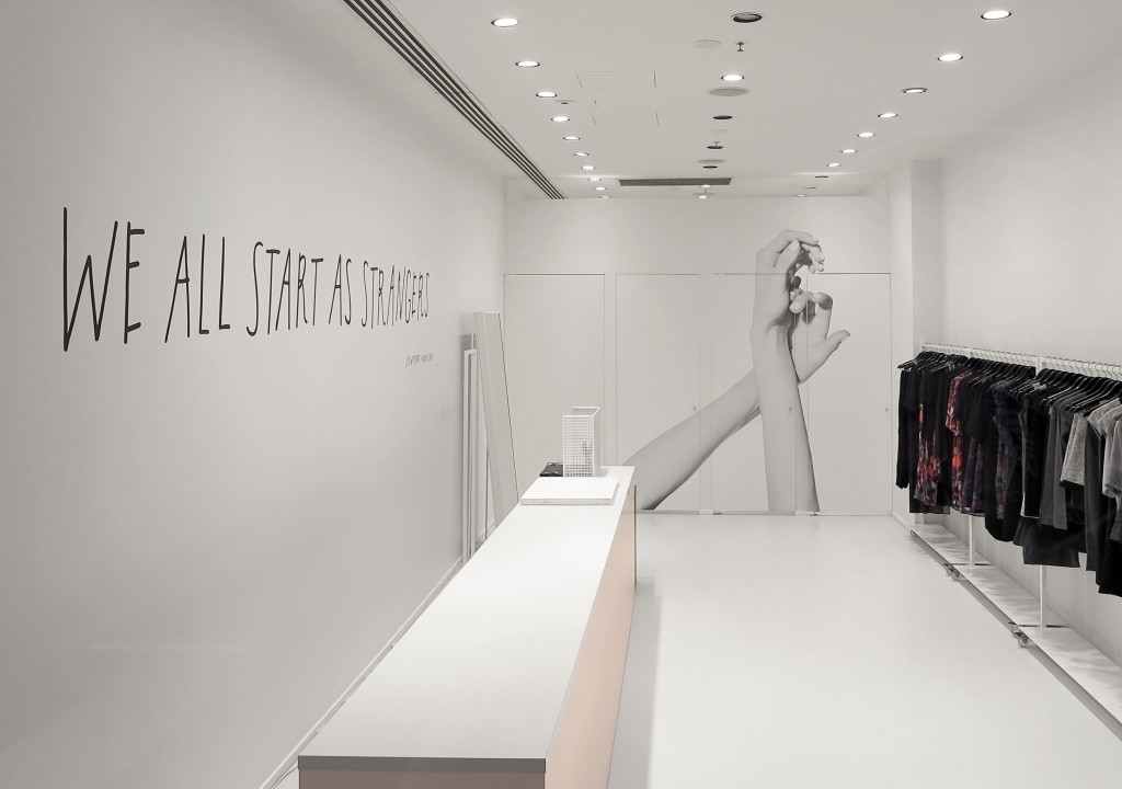 The stunning all white space is the perfect framing to display the AW15 collection, and is made all the more special with an exclusive typography-based art installation by Melbourne artist, Bianca Cash, and a huge graphic print that runs across the change room space.
