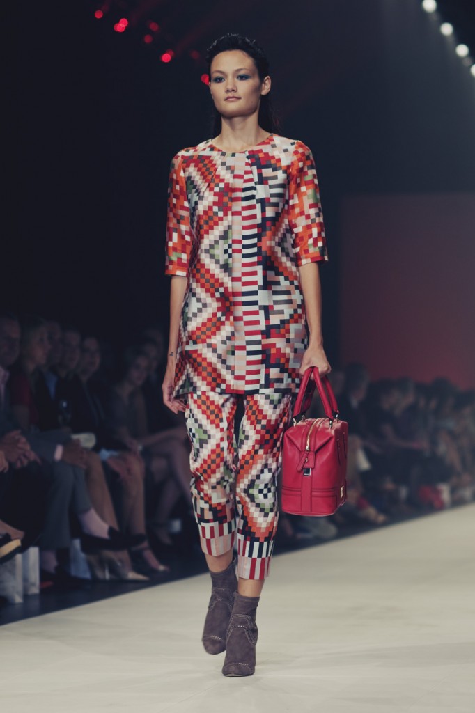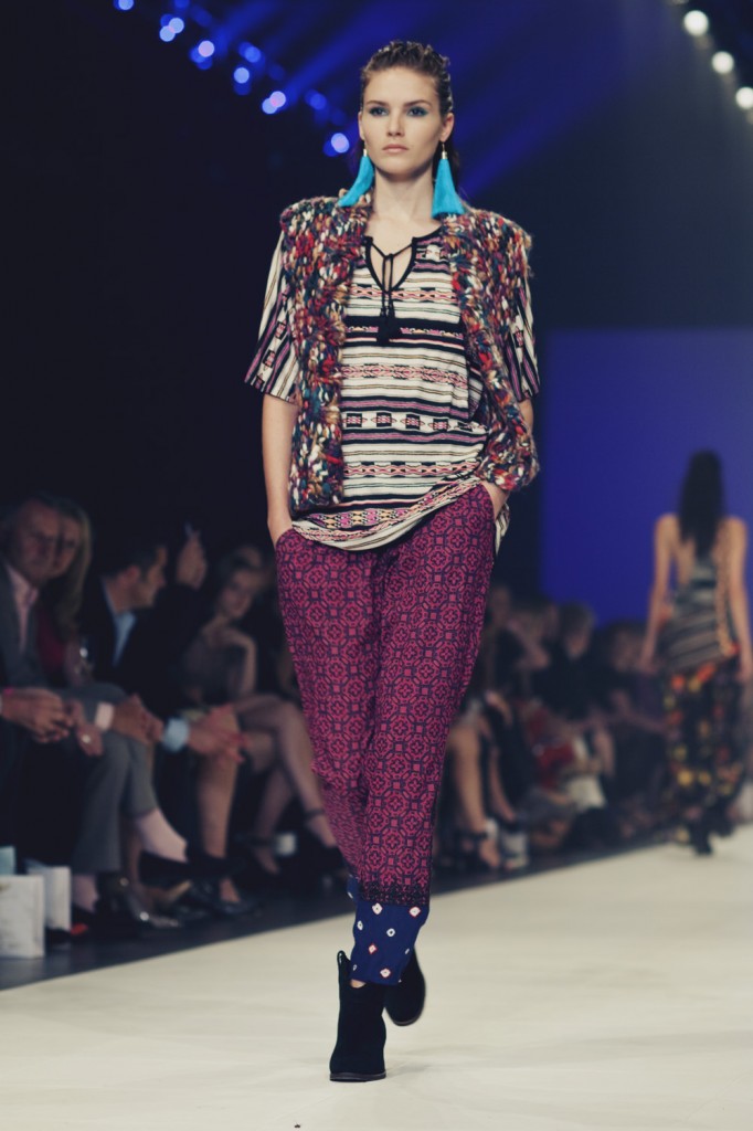 The show, presented by Grazia magazine, was opened with a stellar collection by Ginger & Smart. Fresh faced models, each sporting a pop of lush teal eyeliner, glided down the runway clad in looks inspired by ancient tribal rug techniques- exotic in an unassuming way. Clashing textiles reign supreme.