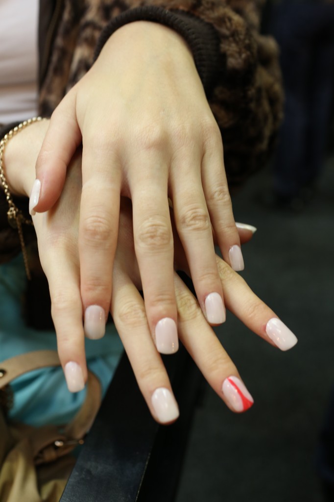 Essie came up with “a fun and flirtatious look to compliment the feminine, elegant and sheer pieces”. A french manicure with a nude base and coloured tips was applied, which is sure to be popular for a fresh and easy look this summer. The nude base colours were Ballet Slippers and Adore-A-Ball, with one layer of each applied. The bright poppy shades for the coloured tips were Mesmerised, Beach Bum Blu, Marshmallow, Secret Story and No More Film, which were applied twice for a strong finish.