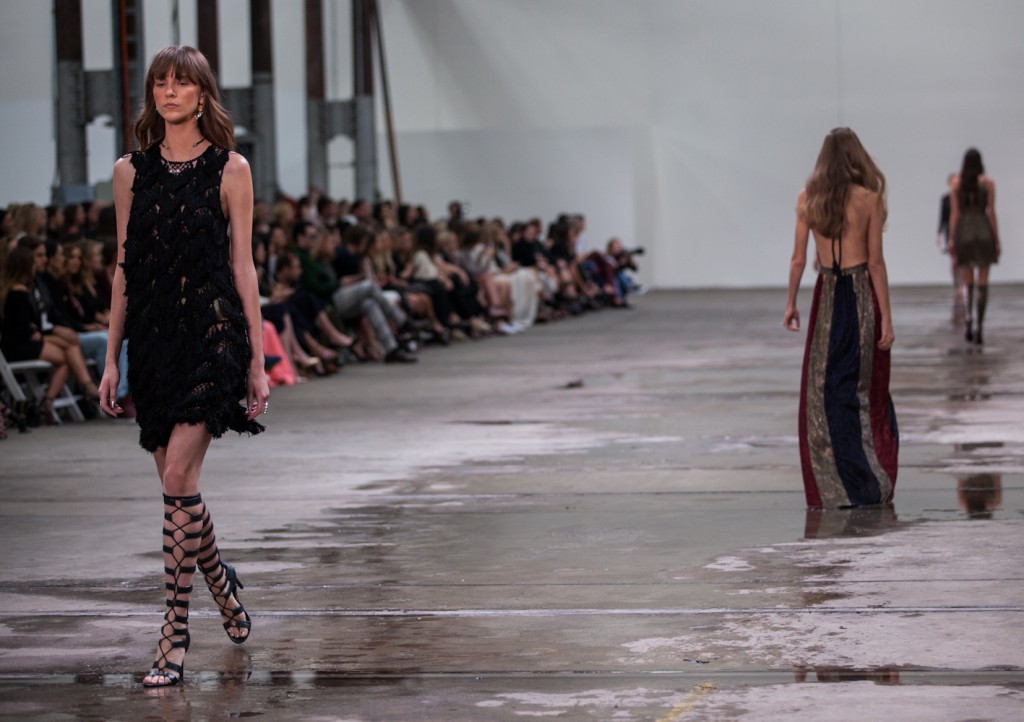 Across the expansive collection, Boho prints and warm, rich colours dominated the colour palate, playing off silver accent pieces and hardware…and as an extra nod to a wet hot summer, it all went happened on a slicked down runway.