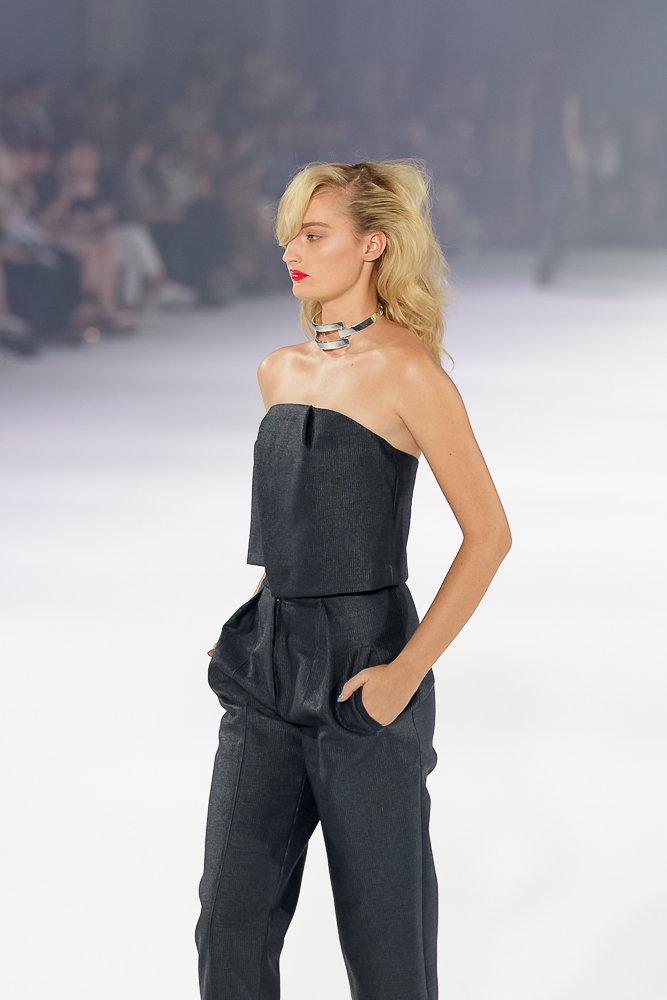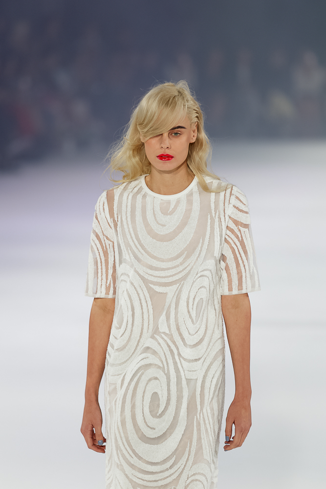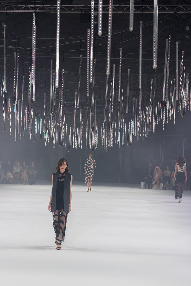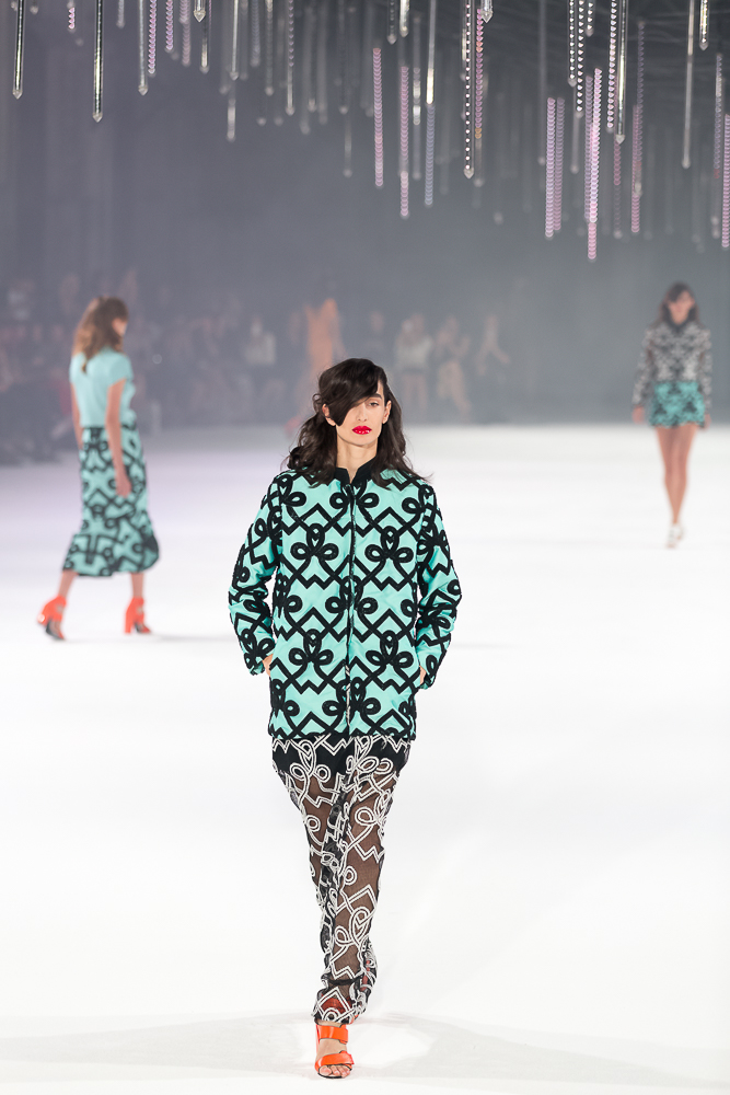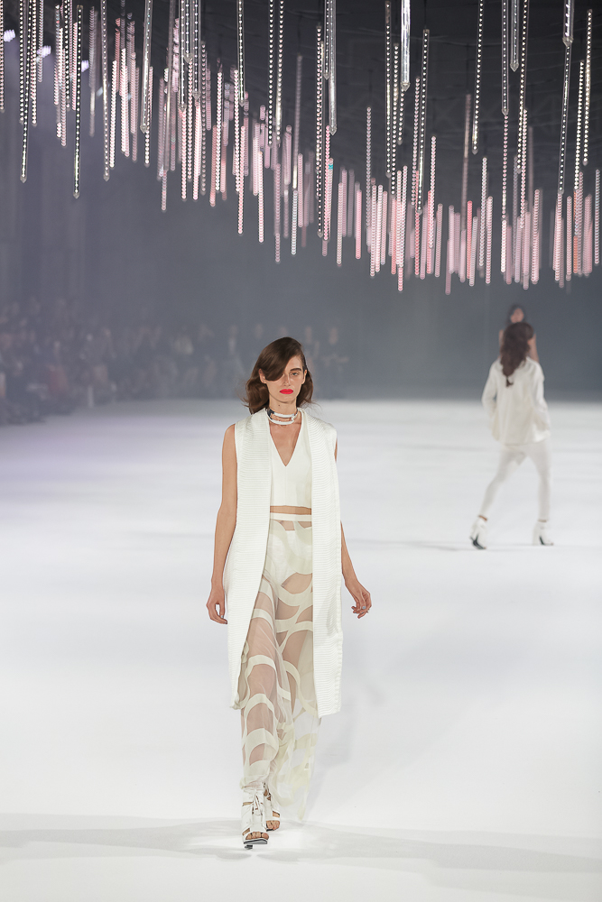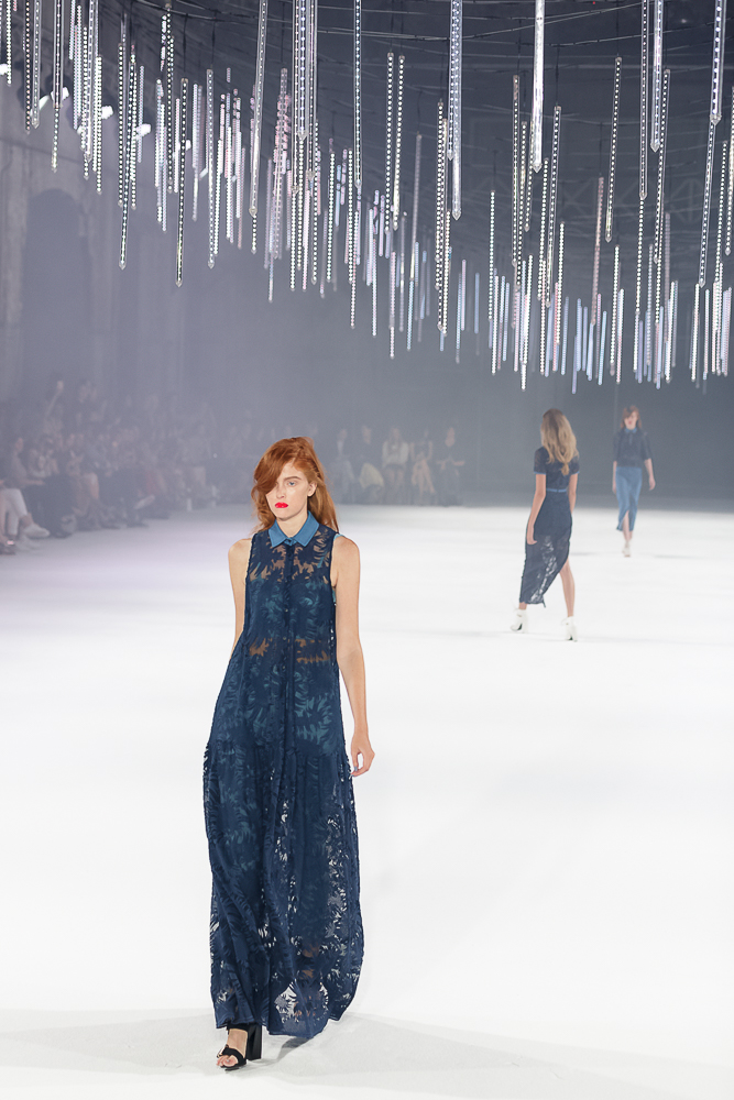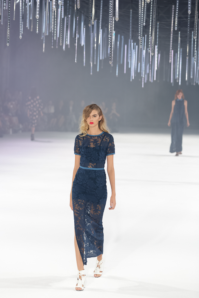 Manning Cartell staked their claim for one of the week’s most dramatic shows, showcasing their SS15/16 collection on a bleached sand covered runway. To set the scene, guests were greeted with a blue lit runway with rods of light hanging from the ceiling.