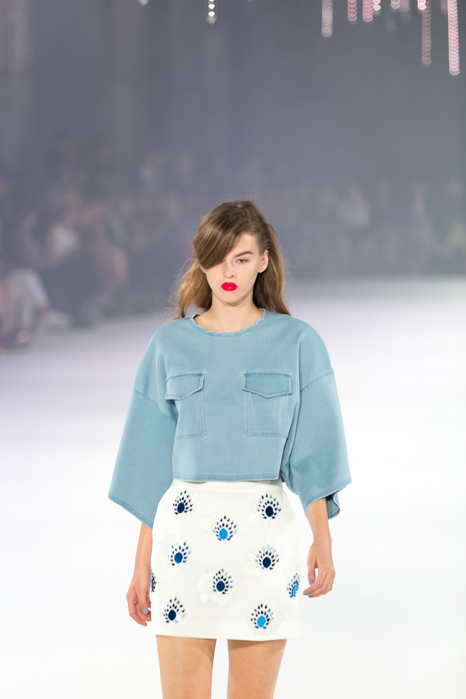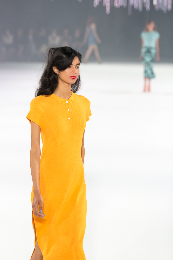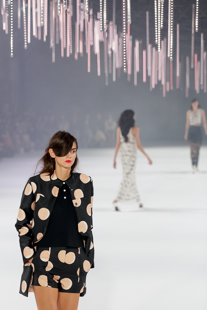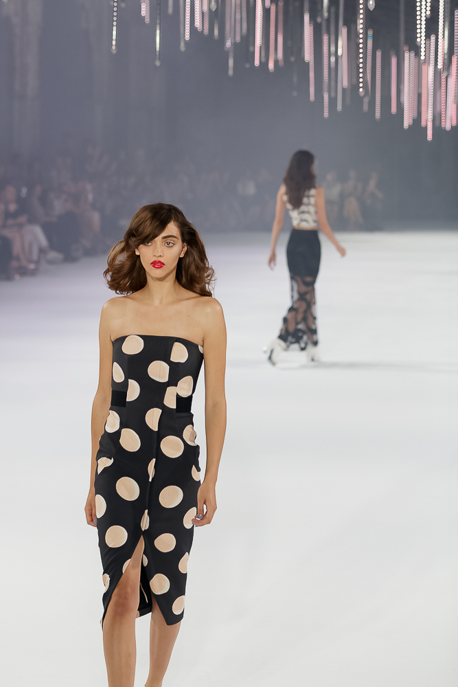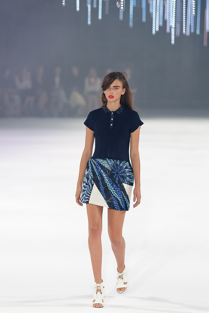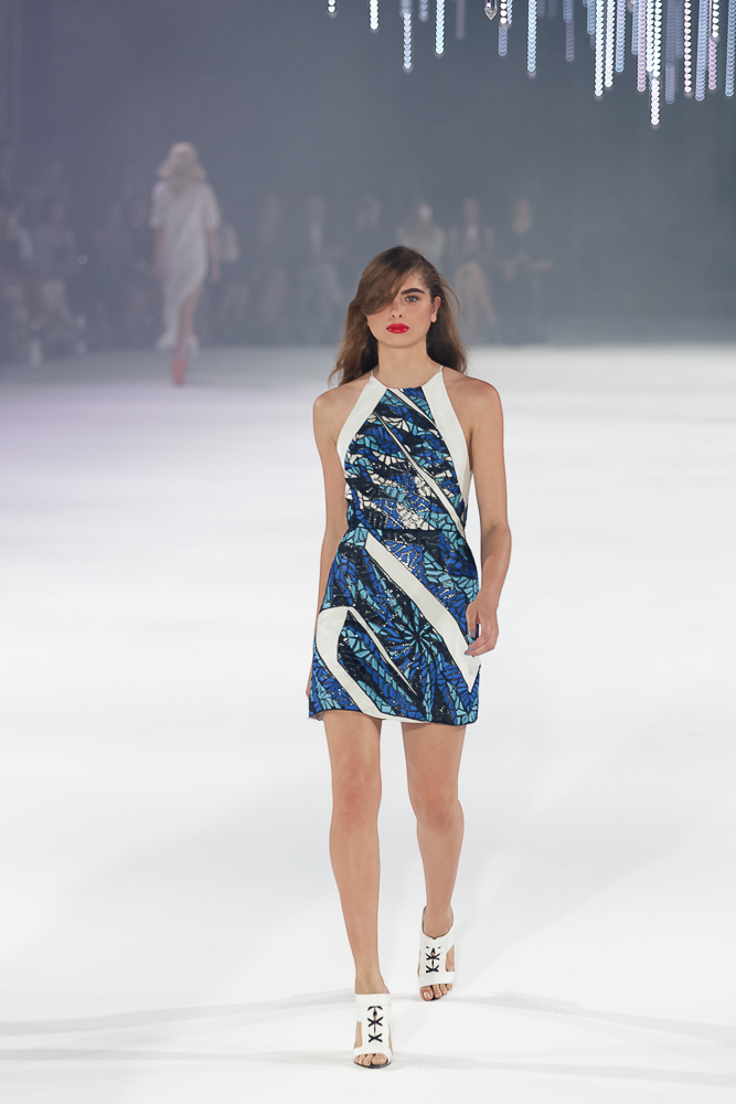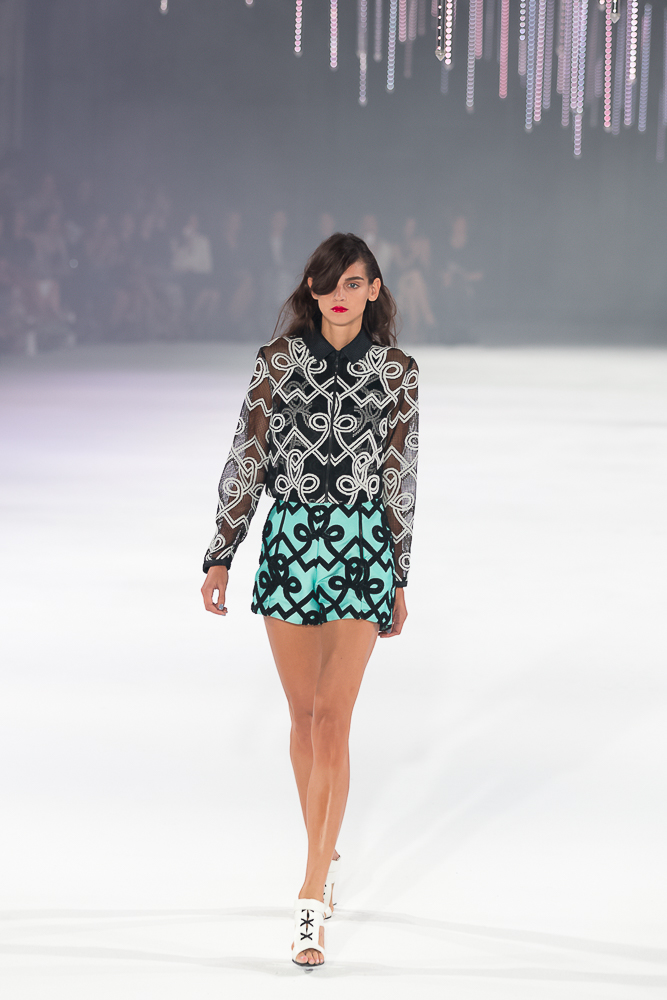 Manning Cartell staked their claim for one of the week’s most dramatic shows, showcasing their SS15/16 collection on a bleached sand covered runway. To set the scene, guests were greeted with a blue lit runway with rods of light hanging from the ceiling.