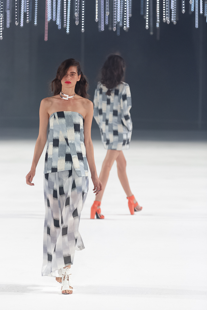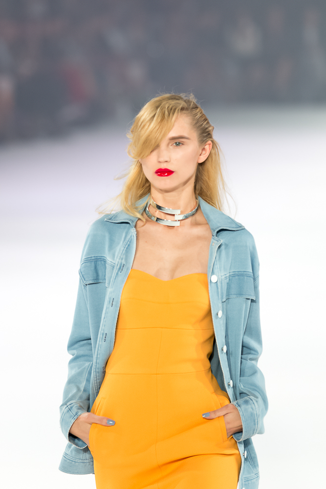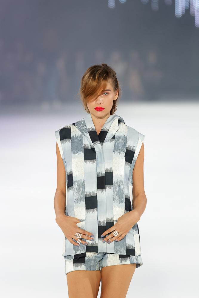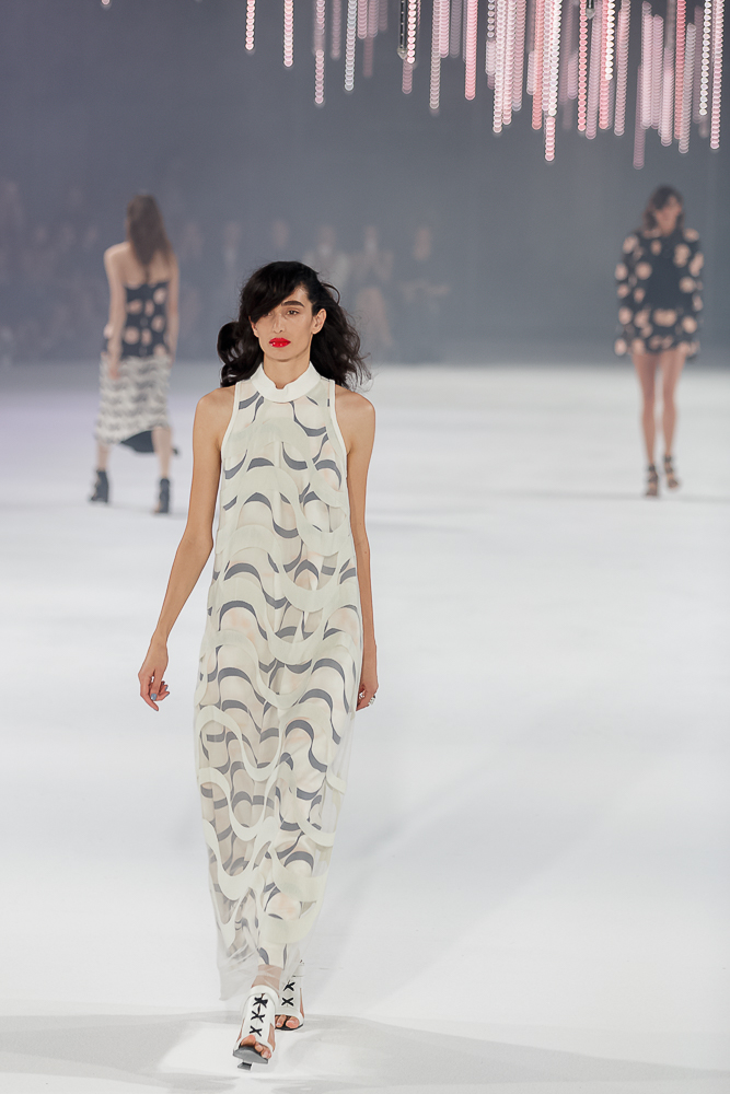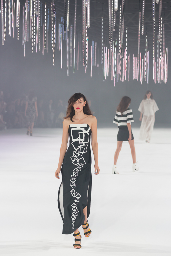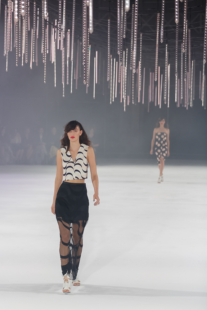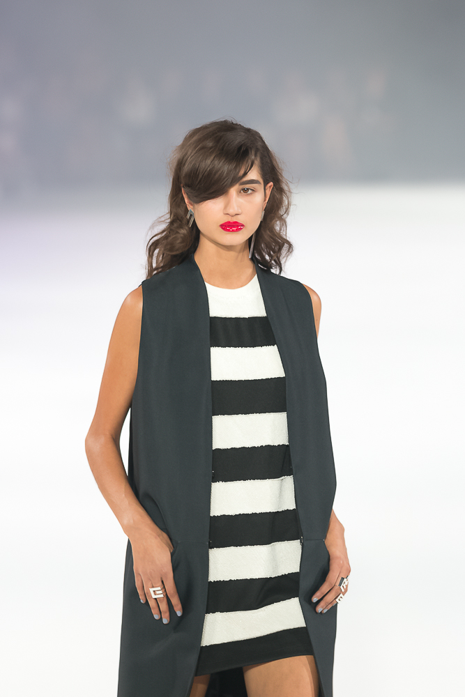 Manning Cartell staked their claim for one of the week’s most dramatic shows, showcasing their SS15/16 collection on a bleached sand covered runway. To set the scene, guests were greeted with a blue lit runway with rods of light hanging from the ceiling.