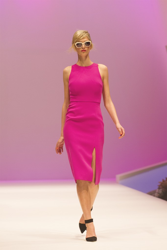 Yeojin Bae’s summer offering opened with a selection of hot pink dresses. A colour traditionally associated with overt femininity, Bae has reworked pink into highly structured, form fitting cocktail wear giving the colour a much needed edge. The collected had a somewhat ‘office to cocktail hour’ sensibility; hemlines were dropped to the knee, necks were high and shoulders were bare. The range featured a number of Spring Carnival appropriate LBDs; an item with which one can never go wrong. Despite the architectural cuts of the range; Bae’s summer collection is still frivolous; when the wearer walks, splits in the garments move with the body revealing pops of colour in the lining of simple black garments.