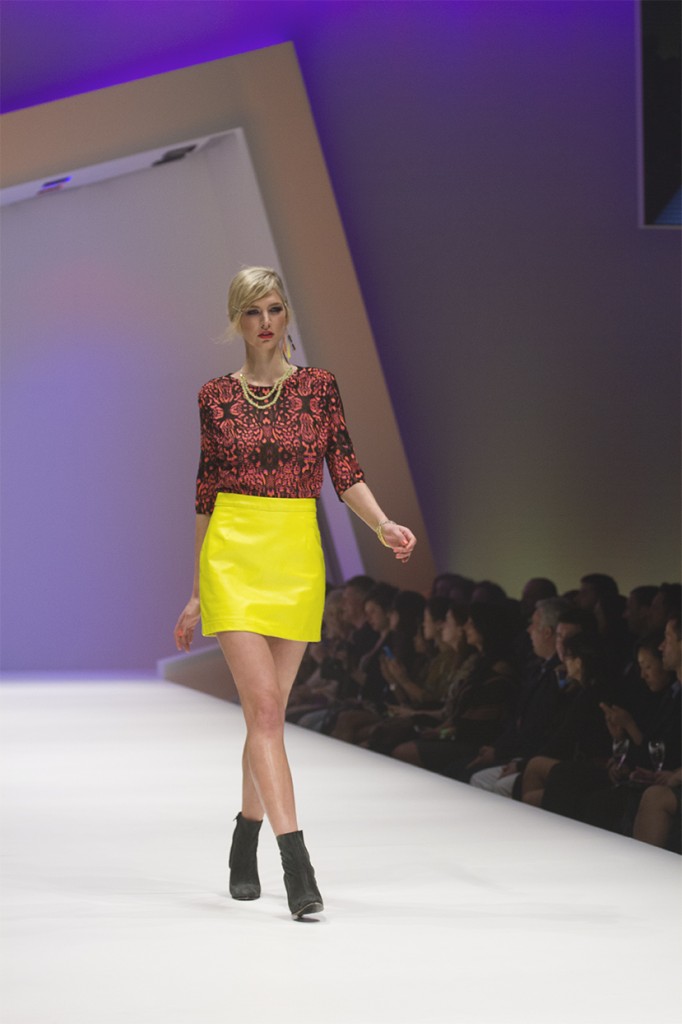 Melbourne designer Alexi Freeman is certainly not afraid to play with busy prints and neon hues, presenting a playful collection with a throwback to the psychedelic 60s. Bright python prints are key to the range, and a neon yellow leather a-line mini gave fluro a modern edge. For those of us who aren’t quite ready to embrace head to toe brights just yet, a black silk maxi featuring a highlighter-hued print from the knee down is the ideal, and very chic, baby step into full-on colour.