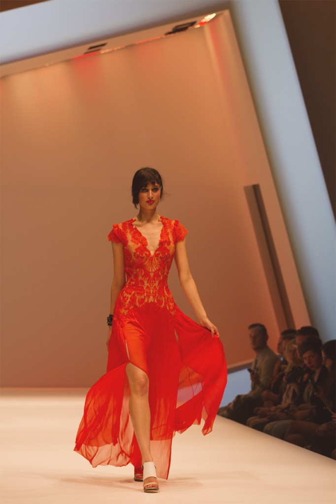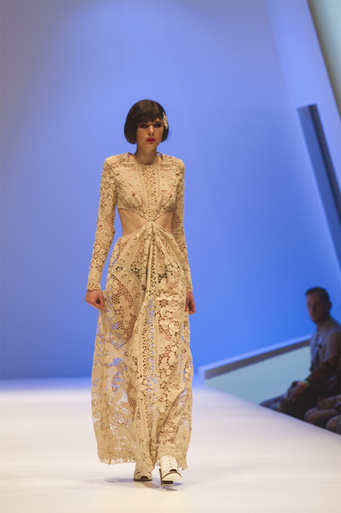 Folk infused and dream like were ideas resonating through Nevenka’s beautiful spring looks. A highlight of the evening, Nevenka’s summer line is heavy on elegant embroidery and soft crochet. Whimsy is given a hint of sex appeal in the way of sheer cut outs in white and nude laces. A latte lace long sleeveed gown showing bare skin at the waist epitomises the feel of this collection; frivolous and bohemian, feminine yet utterly seductive.