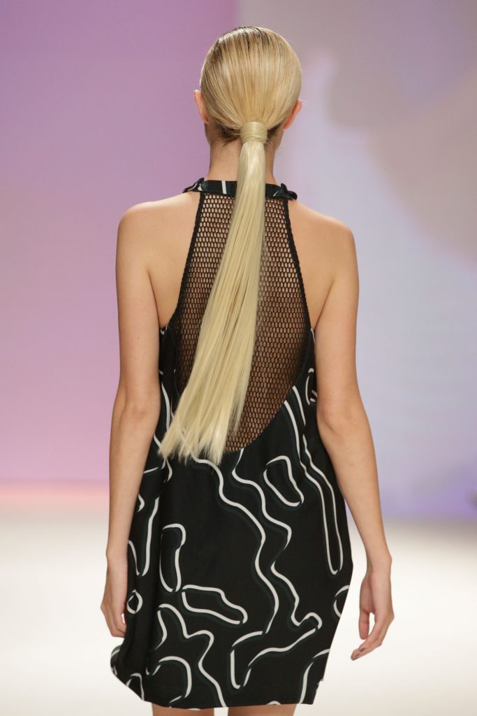 The nineties were on full display for the Contemporary Designer showcase during MSFW. The hair, inspired by 90’s chic minimalism, complemented the effortless and ethereal designs on the runway. Featuring a sharp side part, slicked back into a long pony, this look is perfect for women on the go. To recreate the look at home remember to use Kevin Murphy’s three steps to glamorous hair: Prime, Prep and Finish.