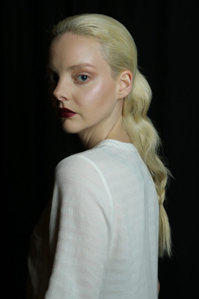 Brush hair back from the hairline, smoothing it out and keeping the sides tight. Use KEVIN.MURPHY SESSION.SPRAY (RRP $36.95) to hold in place. Once hair is all back create a loose plait down the bottom and secure with an elastic.