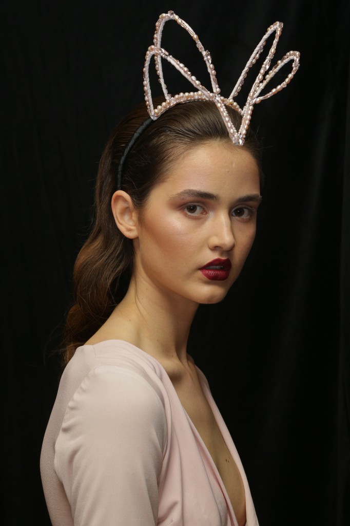“With a nod to the structured, bold-lipped beauties of Tamara de Lempicka’s art deco paintings, this powerful and polished look is all about hyperreal luxe skin, lightly diffused eyes and a graphic statement lip in rich burgundy.”
