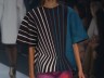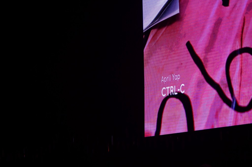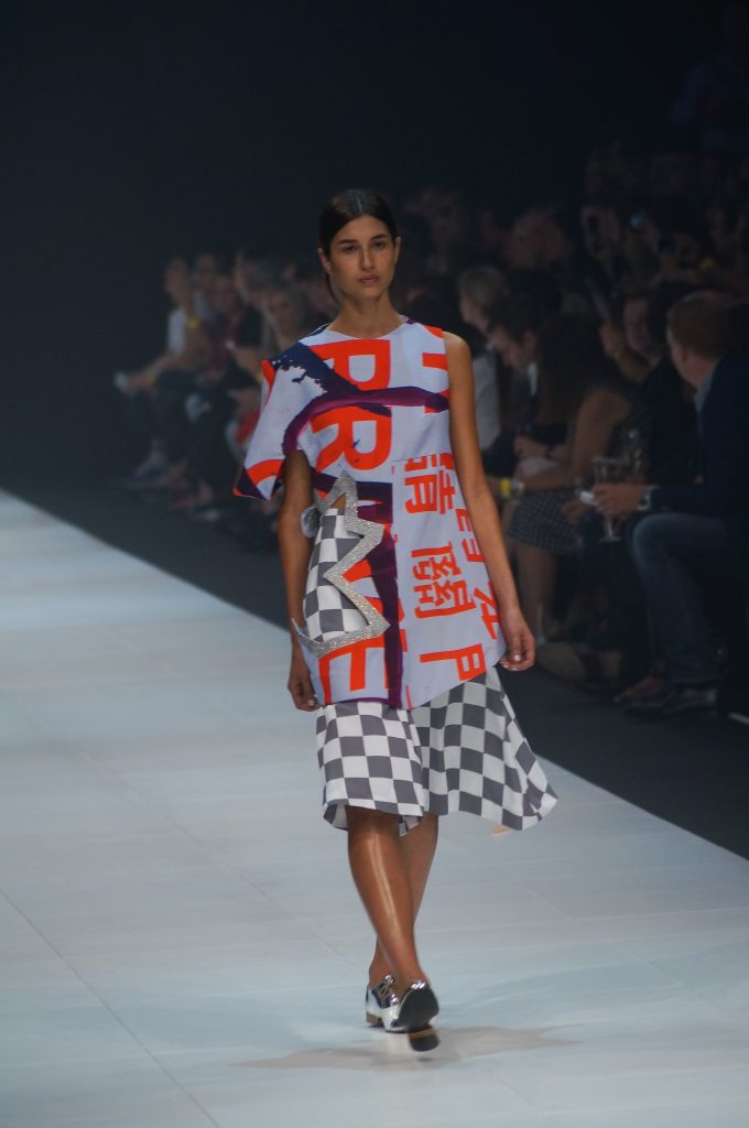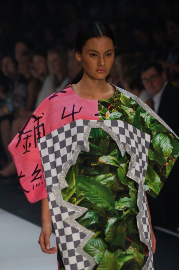 April Yap and her collection, CTRL-C, went meta, bringing textures and techniques from Photoshop onto the runway. With patterns inspired by the appearance of the transparent layering tool and signage from China Town, the two seemingly unrelated inspirations were connected with the theme of “there, but not really there”. This idea extended into the clothing, with large areas of fabric cut out, or featuring cropped layers.