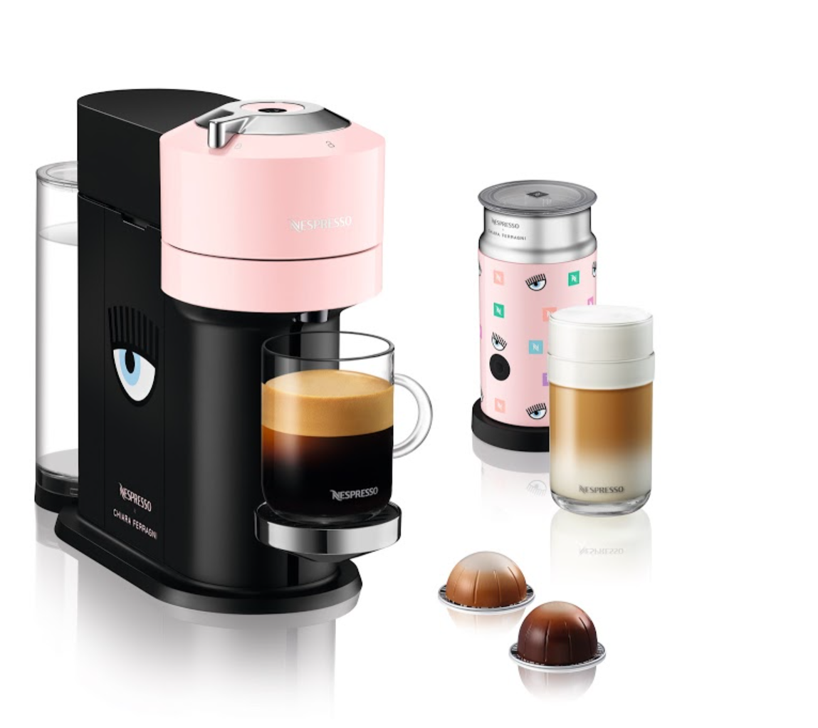 Elevate classic tastes with the limited-edition machine and accessories Blend aesthetic style and delicious coffee with the branded limited edition Nespresso x Chiara Ferragni Vertuo Next machine. A twist on Nespresso’s newest machine, available in a beautiful pastel pink colour, with Chiara’s iconic logo emblazoned on its side. The intuitive one-touch machine can prepare a range of different coffee sizes, for every taste or moment with friends and family all year long.
