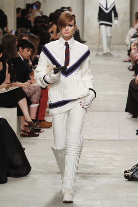 In classic Chanel style, the collection was largely monochrome. The first looks shown were nautical and sport-influenced, with wide stripes, dandy ties and cricket gear as accessories.