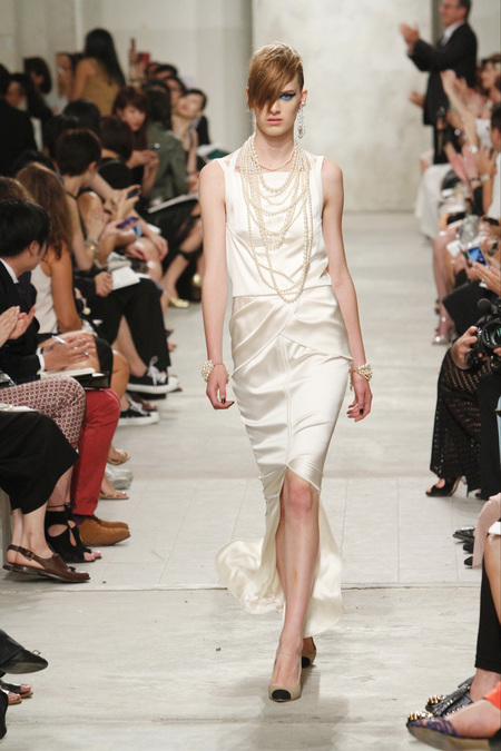 A touch of classic Chanel class closed the Resort ’14 line, with ivory evening wear and long strings of pearls.