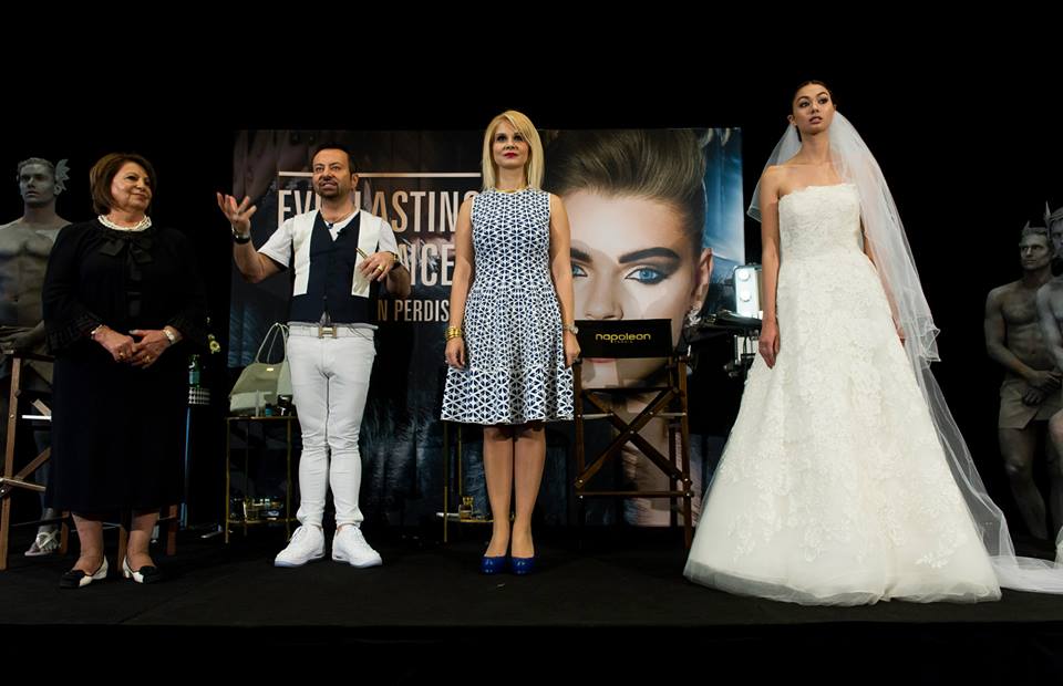 Creating the perfect smokey eye for his partner Soula-Marie Perdis, Napoleon treated the audience to some of his best advice when applying colour around the face. Starting with Color Disc in Midnight Express, Napoleon gently applied the shimmery silver colour over the eyes and filled the waterline for extra drama. Next, he used China Doll Gel Eyeliner Yin on the top and bottom lash line, filling the inner corner of the eyes. Adding a touch of Crème de la Crème Lava, this smudge-proof, longwearing gel eyeliner glides on easy and sets to a highly pigmented finish. Finishing the eyes with Long Black Mascara, Napoleon set the look with big bold brows using his Browtox and brush to fill in spaces.