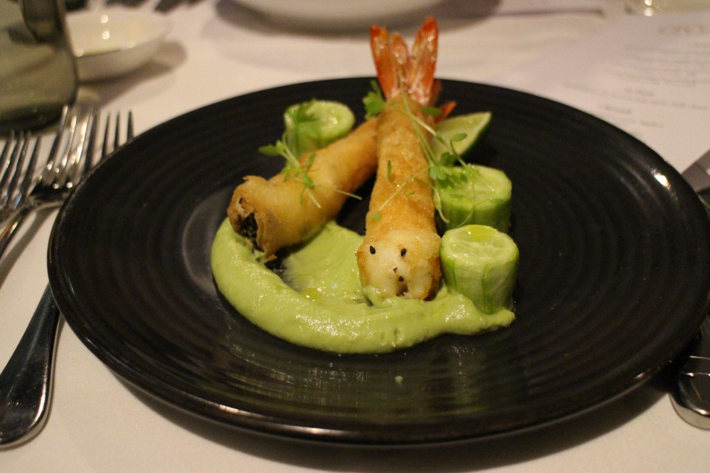 Our foray into the Spring menu was a taste of the sea, selecting Caramelised scallops, broccoli pangrattato, prosciutto crisps with a lemon aioli and the Crispy King Prawn with black sesame, avocado, picked cucumber and lime.