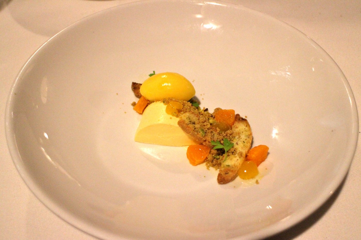 Our second dessert was the Citrus Bavarois, Pistachio Cantucci and Mandarin Sorbetto. This dessert was a lighter option than the first with sweet citrus flavours. The mandarin sorbetto was a highlight with a citrus kick.