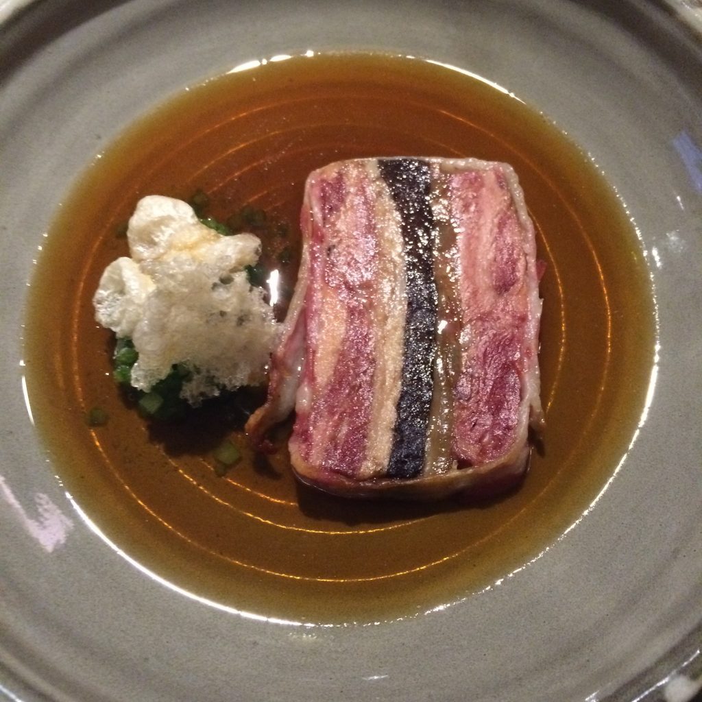 The Pig nose to tail with a smoked bacon broth and preserved celery was one of my favourites of the evening. Pig parts from nose to tail were layered like a terrine including a layer of black pudding. One would have thought that the bacon broth would be too much pork for one dish but the smokiness of the broth from the bacon really added to the taste of the dish.