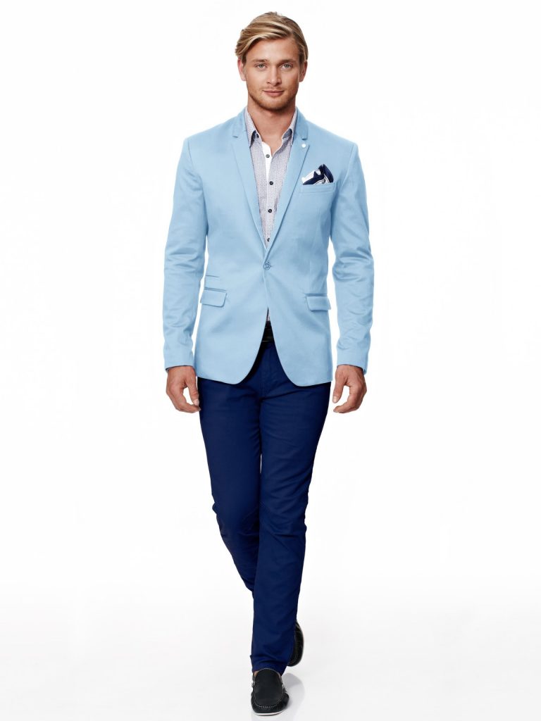 Start with a coloured blazer like these. Baby blue is a great start, but any colour will do as long as you can match the pants and shirt in similar tones. Navy is a menswear favourite so you can never go wrong with a dark chino pant. Finish with pocket square for some extra flair.