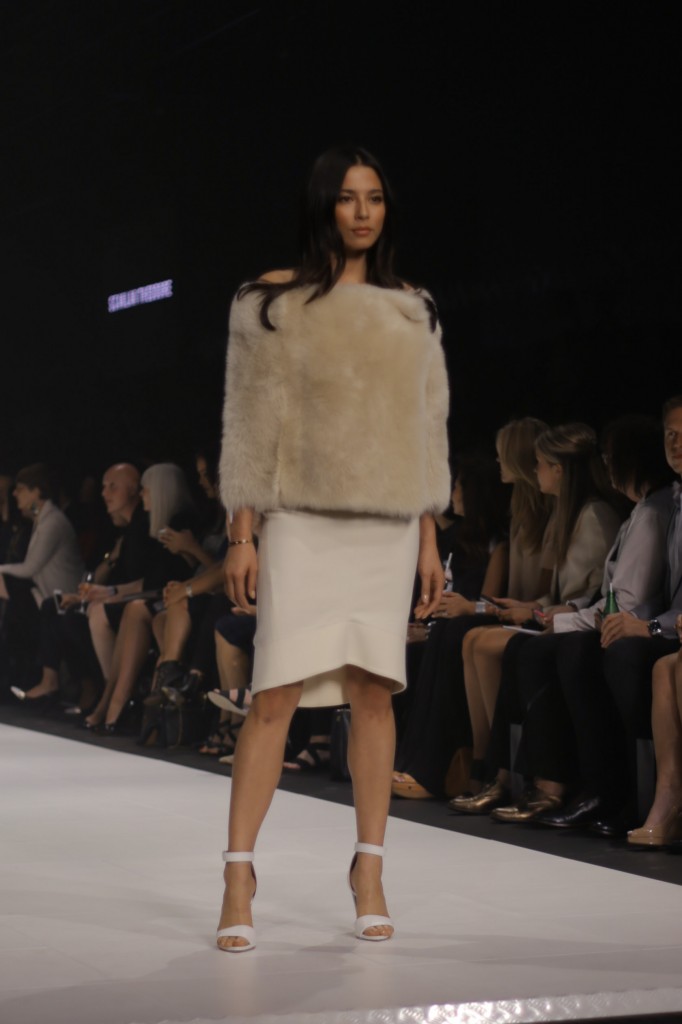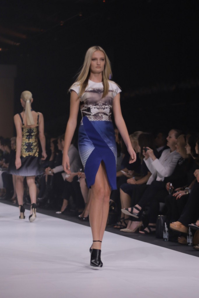 Camilla and Marc favoured a modern silhouette this season, teaming boxy and structured separates with a line skirts and drop crotch trousers. Michael Lo Sordo’s collection followed suit as far as modernity, with a line of fitted dresses in bold digital prints and sexy monochrome cut-out party dresses.