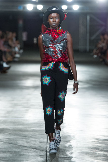 Emma Mulholland brought a sense of playfulness to the runway with her display of graphic prints and feather detailing. Featuring highly intricate sequining and embroidery, synonymous to the Emma Mulholland brand, her collection was bold and captivating.