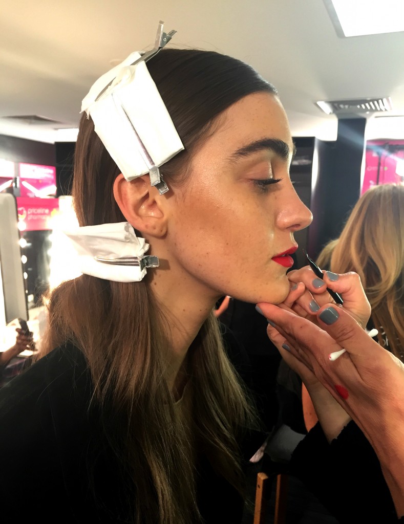The models stepped out with glowing complexions, red matte lips and defined eye shadow across their lids, which extended back towards their temples. Working the base with Revlon Photoready Insta-Fix Makeup and Revlon Photoready Prime + Anti Shine Balm for light coverage, makeup director Rae Morris wanted the girls to look youthful and feminine.