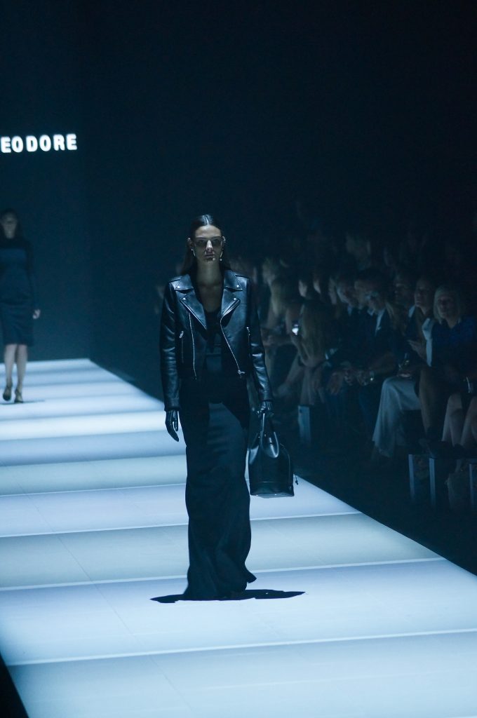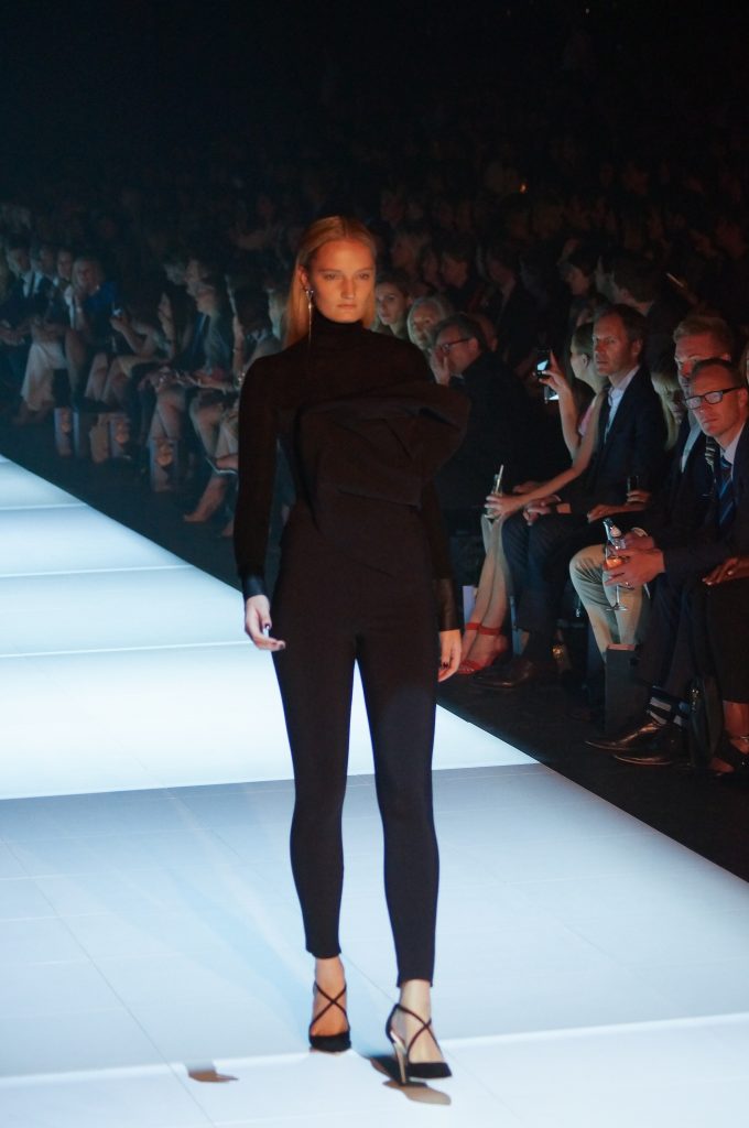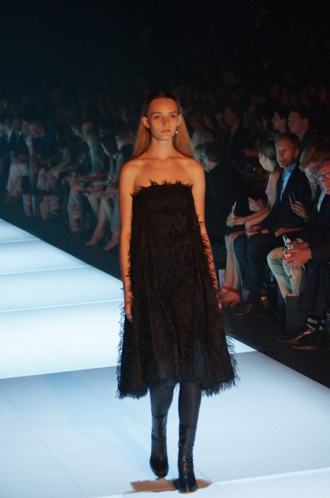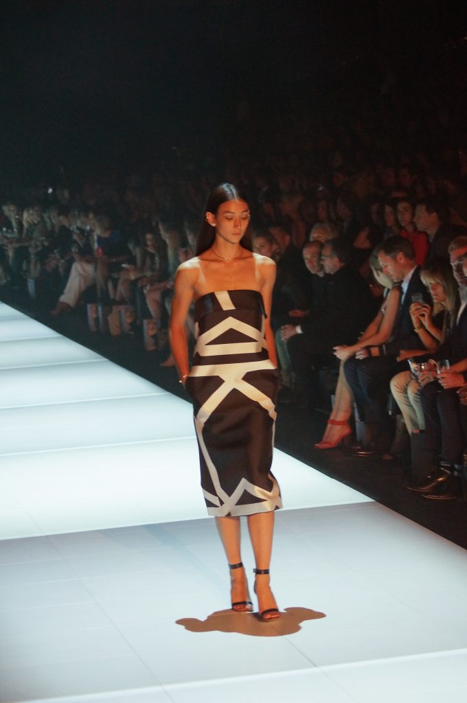 An opening by Scanlan Theodore affirmed that fine turtlenecks are the layering piece of the season, used to work back fitted bodices and to add warmth (literally) to strapless cocktail frocks. Black reigned supreme once again, with a play on texture, rather than print, adding interest to block coloured looks.