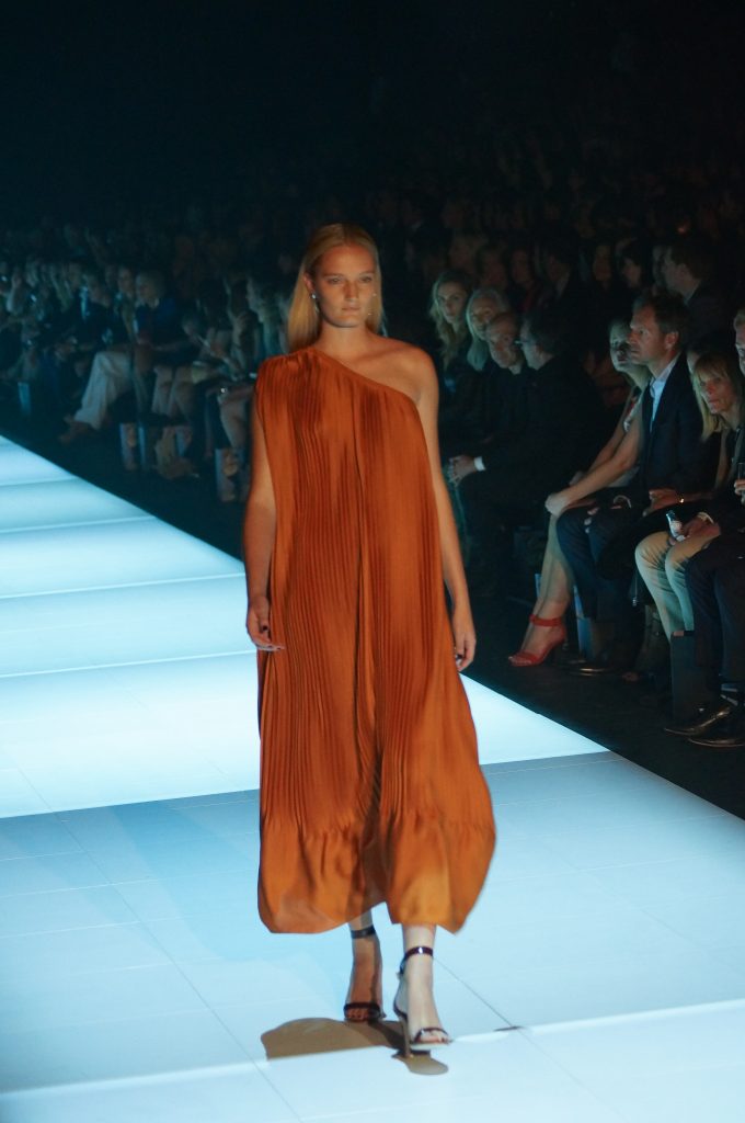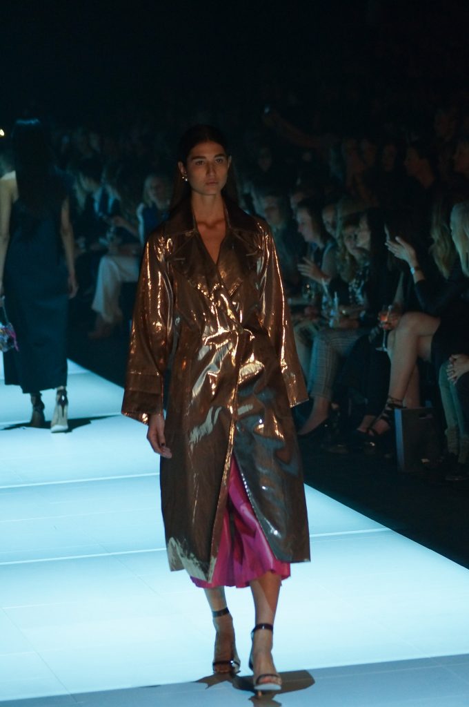 TOME introduced pops of colour to the runway in the form of a crisp blue cotton shirt and a pink accordion pleated midi skirt, and a metallic trench shot to the top of our winter essentials list. Black was a rarity, appearing only on a handful of asymmetric, ankle grazing dresses, featuring exposed shoulders and sultry plunging necklines.